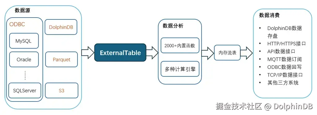解决方案:DolphinDB 3.00.4版本推出外部表跨数据库联邦查询功能,构建多源数据融合技术方案,具体如下: