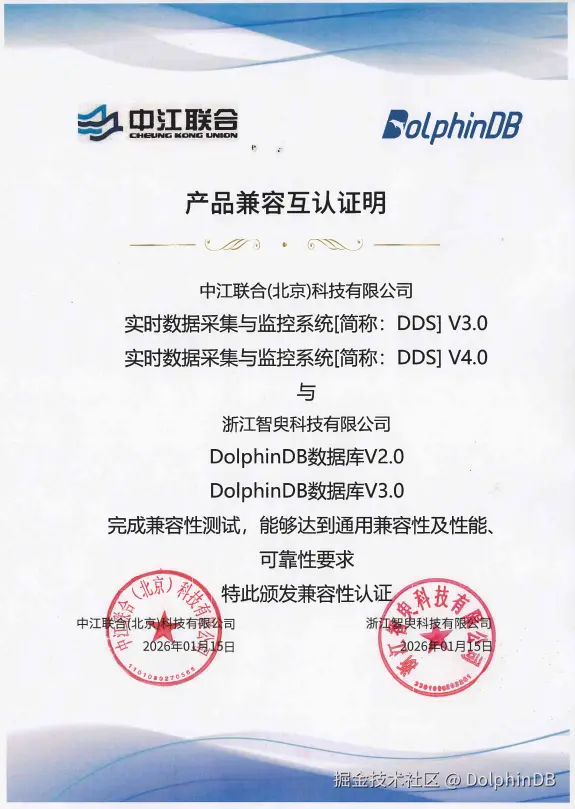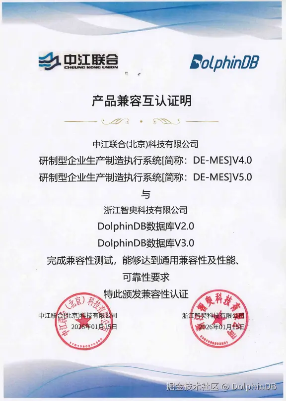 近日,浙江智臾科技有限公司(简称:DolphinDB)与中江联合(北京)科技有限公司(简称:中江联合)正式完成产品兼容互认。双方旗下核心产品经过全面兼容性测试,达到通用兼容性及性能、可靠性要求。