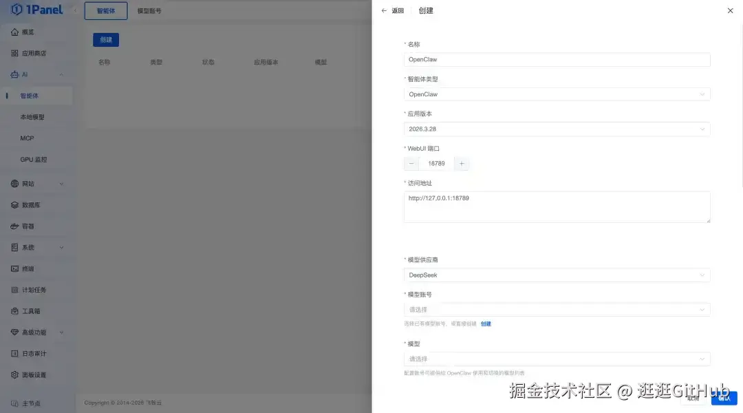 装好之后,通过 1Panel 的界面管理模型、查看运行状态、配置智能体。