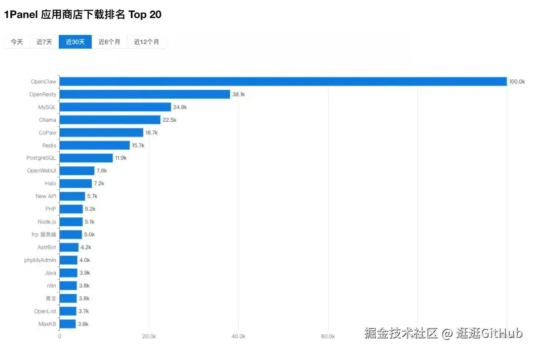 OpenClaw 在 1Panel 应用商店的近 30 天下载量突破了 10 万次。