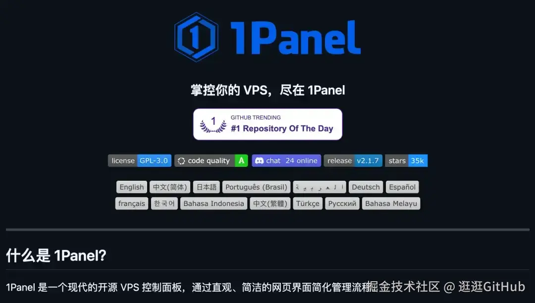 跟宝塔面板做的事情类似,1Panel 是 Go 语言 + Docker 容器化架构,更现代。