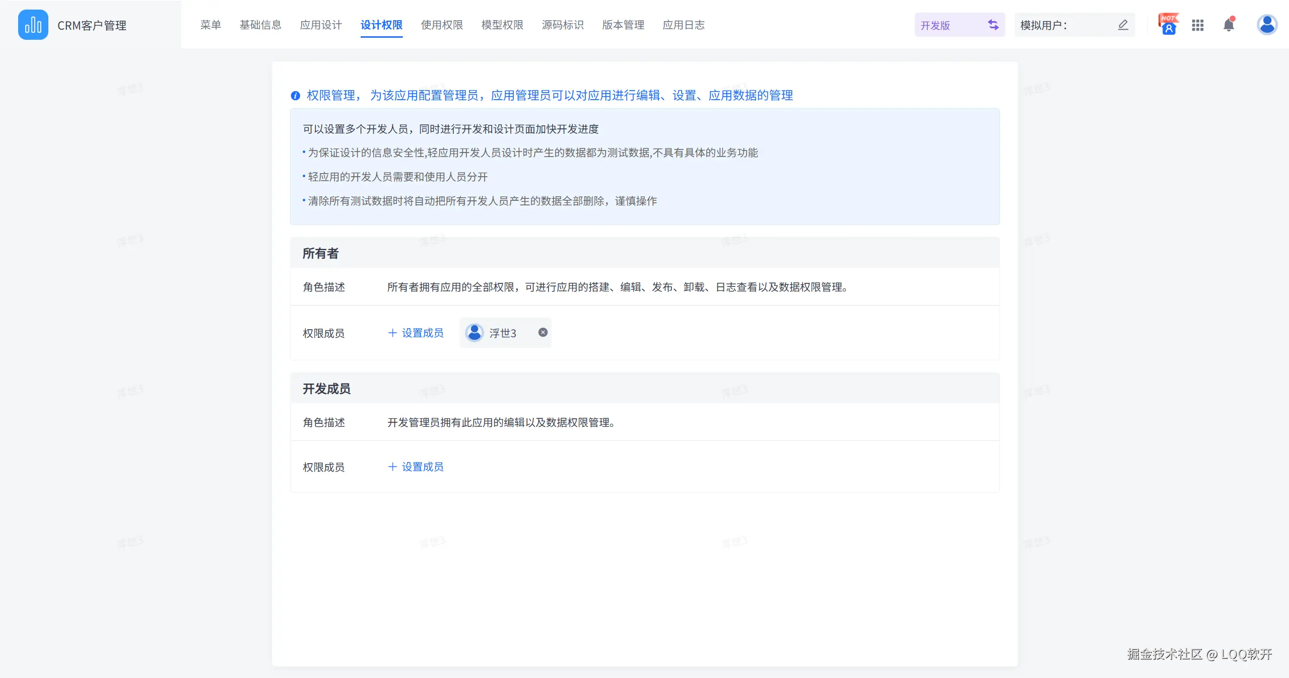 应用级权限:每个应用可以独立设置管理员、开发人员、测试人员、普通用户等角色,不同角色拥有不同的操作权限。