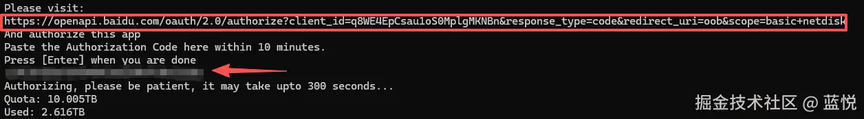 第一次运行 bypy info 时,终端会输出一个授权链接。