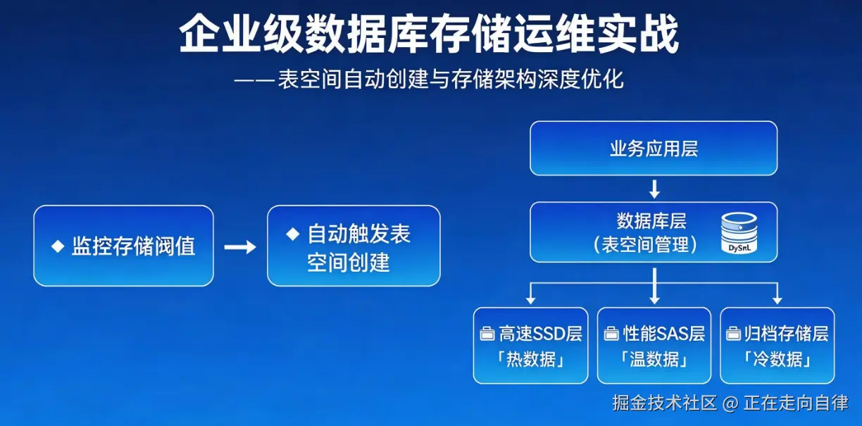 场景:某电商平台订单、用户、商品、支付混跑,原存储单盘,I/O 瓶颈严重,创建表空间耗时费力。改造目标:实现存储分层,一键创建表空间,提升性能、降低运维成本。