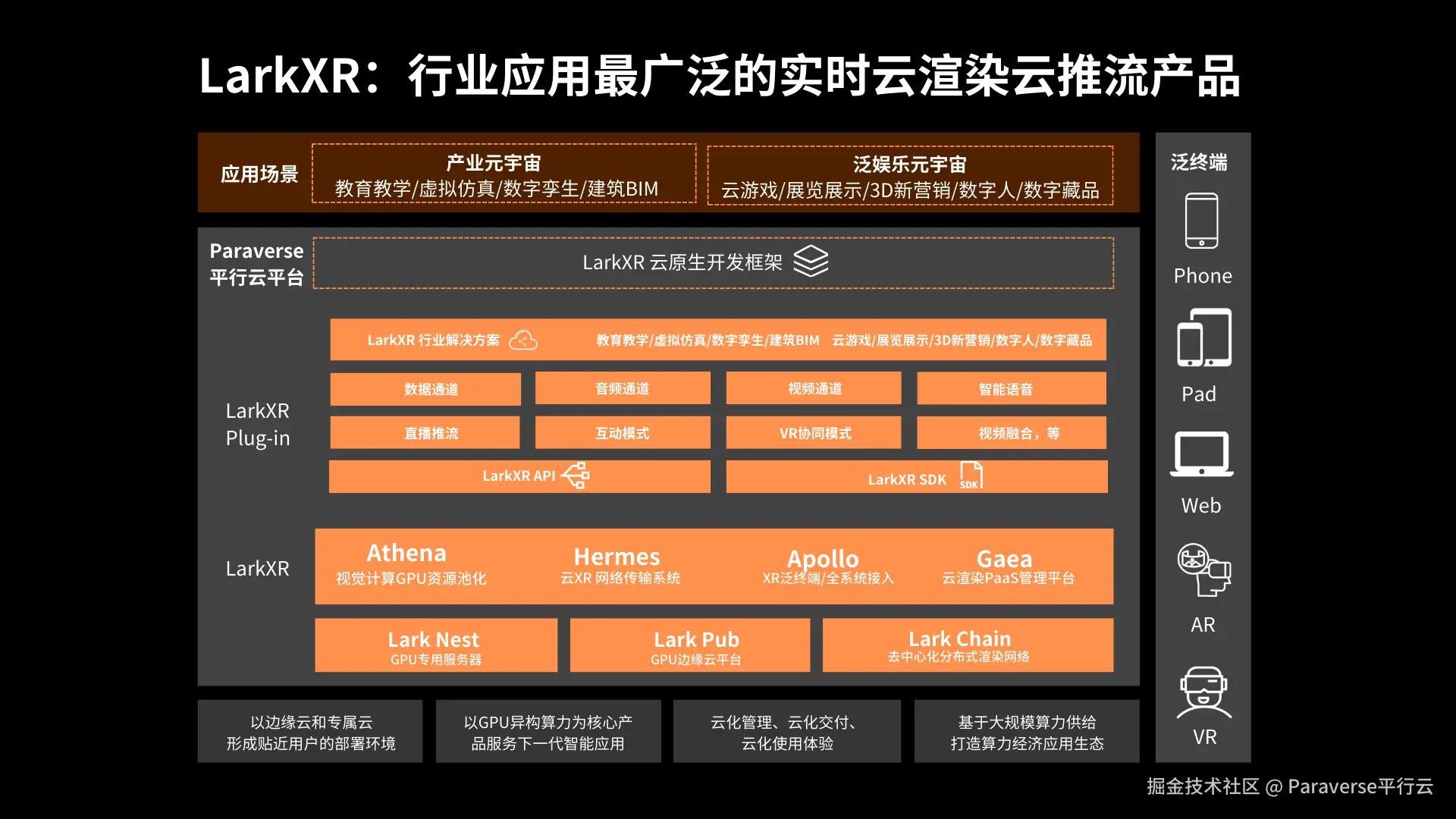 LarkXR是一套基于GPU云化、图形容器、音视频实时编解码、网络传输优化等核心技术的通用型实时云渲染解决方案,将复杂计算和图形渲染部署在云端服务器,将超低时延的交互视频流推送到各类2D/3D/XR终端上,使高精度百万级构件、海量异构系统数据汇聚融合在同一个三维场景中,不依赖于高配硬件设备,保障在国产信创软硬件环境上流畅的运行、使用及传播, 实现跨终端协同、多角色并行、多并发弹性伸缩和模型实时更新。