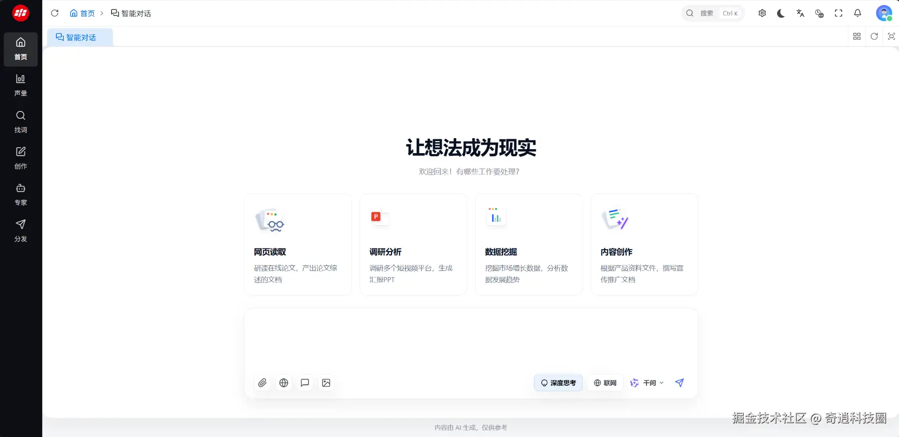 专家智能体:AI 不再是通用问答工具,而是拆解为贴合业务分工的角色化能力,在选题判断、品牌表达、用户洞察、营销策略等环节提供专业协助,让 AI 深度融入真实业务流程,支撑多线程内容竞争策略。