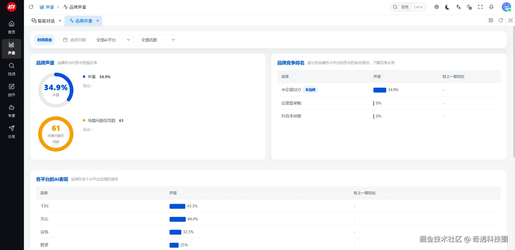 第三步:监测声量反馈。内容发布后,紧盯声量洞察数据,分析品牌在 AI 回答中的出现频率、情感倾向,动态优化后续内容策略。