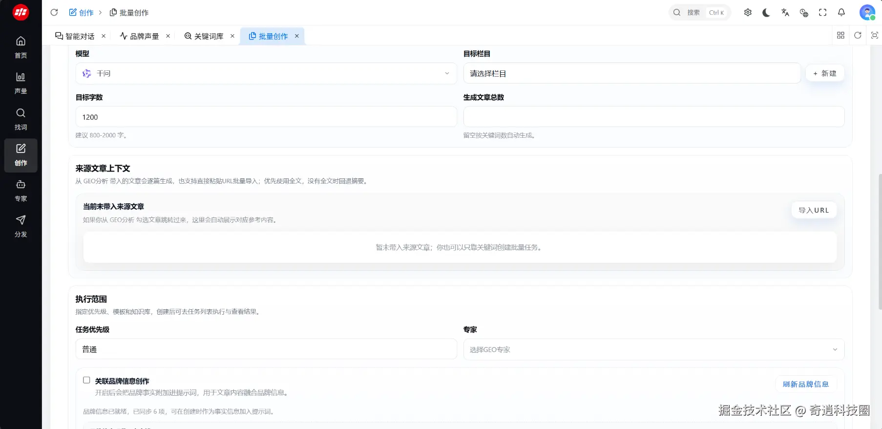 新工作台统一展示企业运营上下文,管理者可实时查看 Token 余量、服务有效期,避免资源不足影响业务推进。同时优化默认功能入口与常用功能快捷导航,团队无需在多页面频繁切换,即可快速开展工作。这一设计大幅提升操作效率,也标志着 GEO 从 “工具” 向 “平台” 全面跨越。