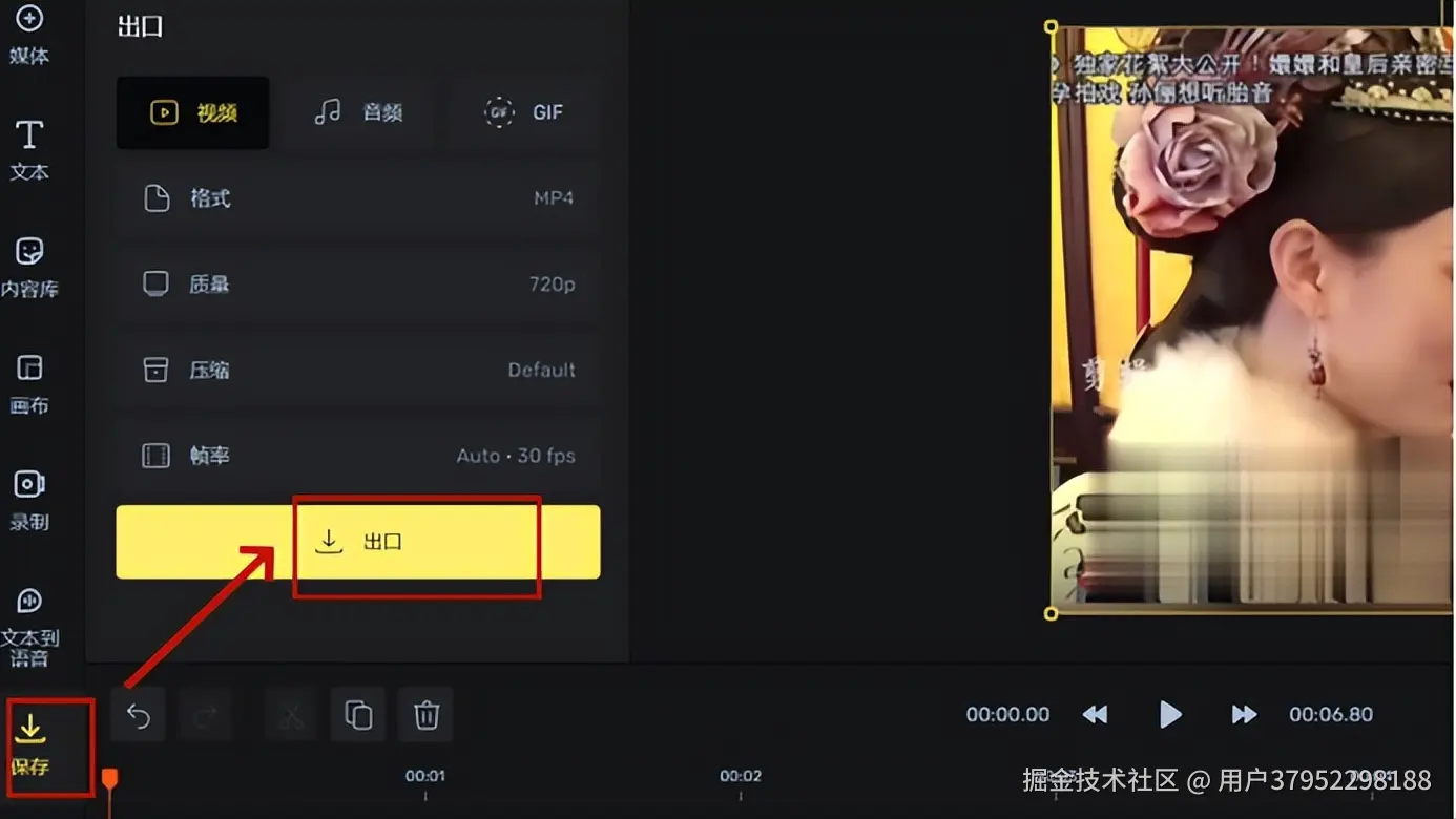 步骤4,在“保存”选项里点击“出口”,即可下载视频文件。