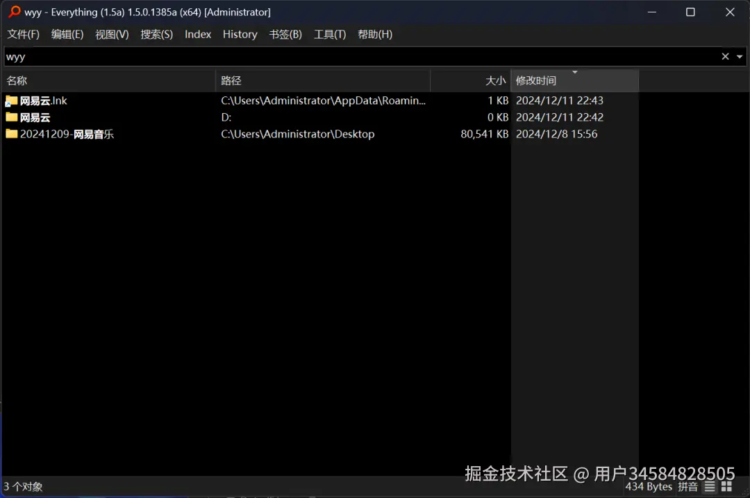 当我用了拼音搜索时,输入“wyy”时就能搜索出“网易云”的文件和文件夹了。