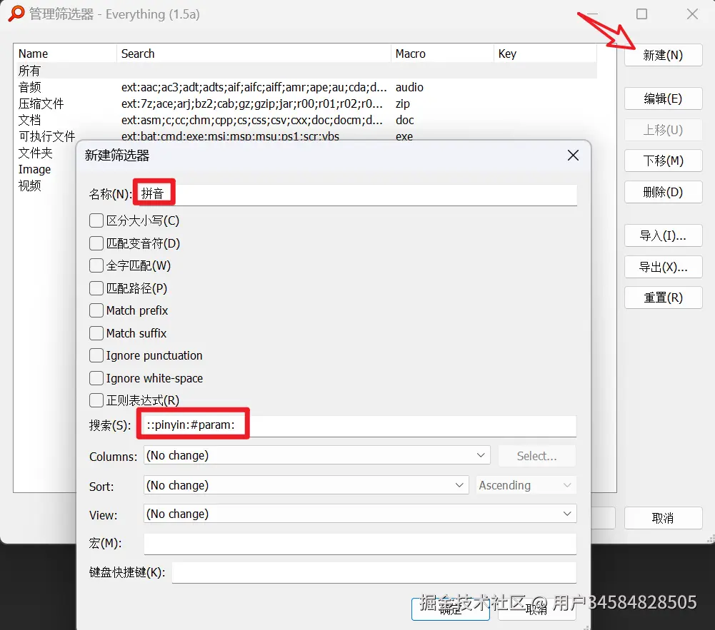 然后点“新建”,名称这里填写“拼音”,搜索处填“ ::pinyin:#param: ”,填完后同样记得点“确定”。