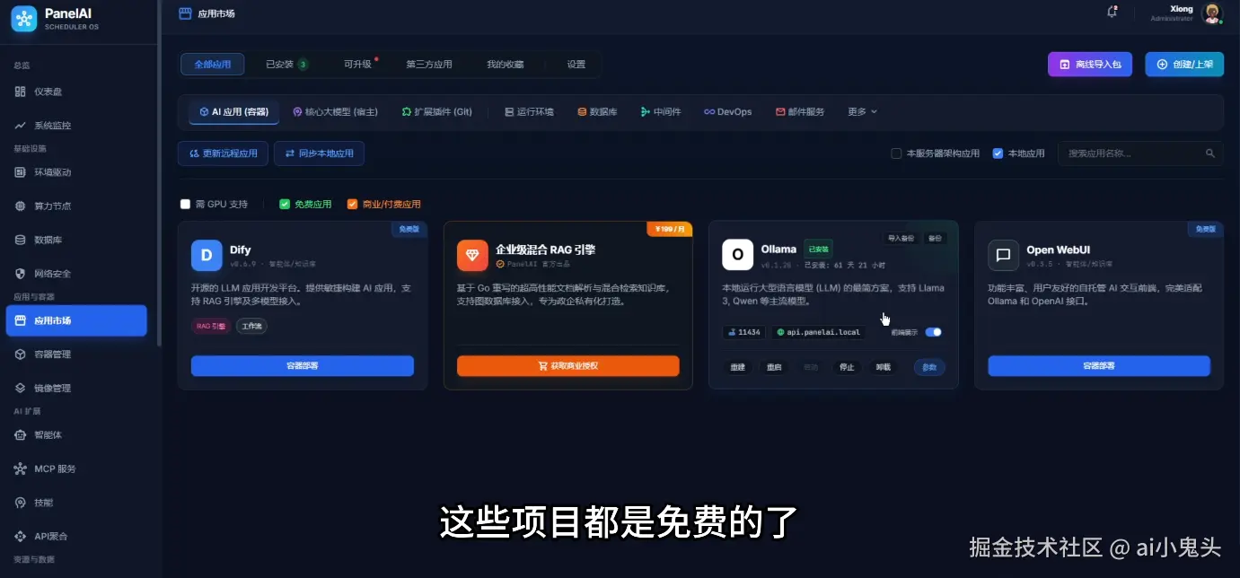 - 应用市场:上线后几乎全是免费项目(Ollama、大模型、OpenWebUI、Dify等),买断即永久使用。