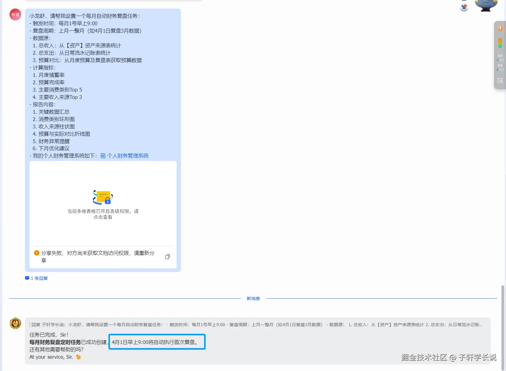 然后在飞书里打开小龙虾,最核心的就是那套财务管理系统,丢给它让它管理就好。