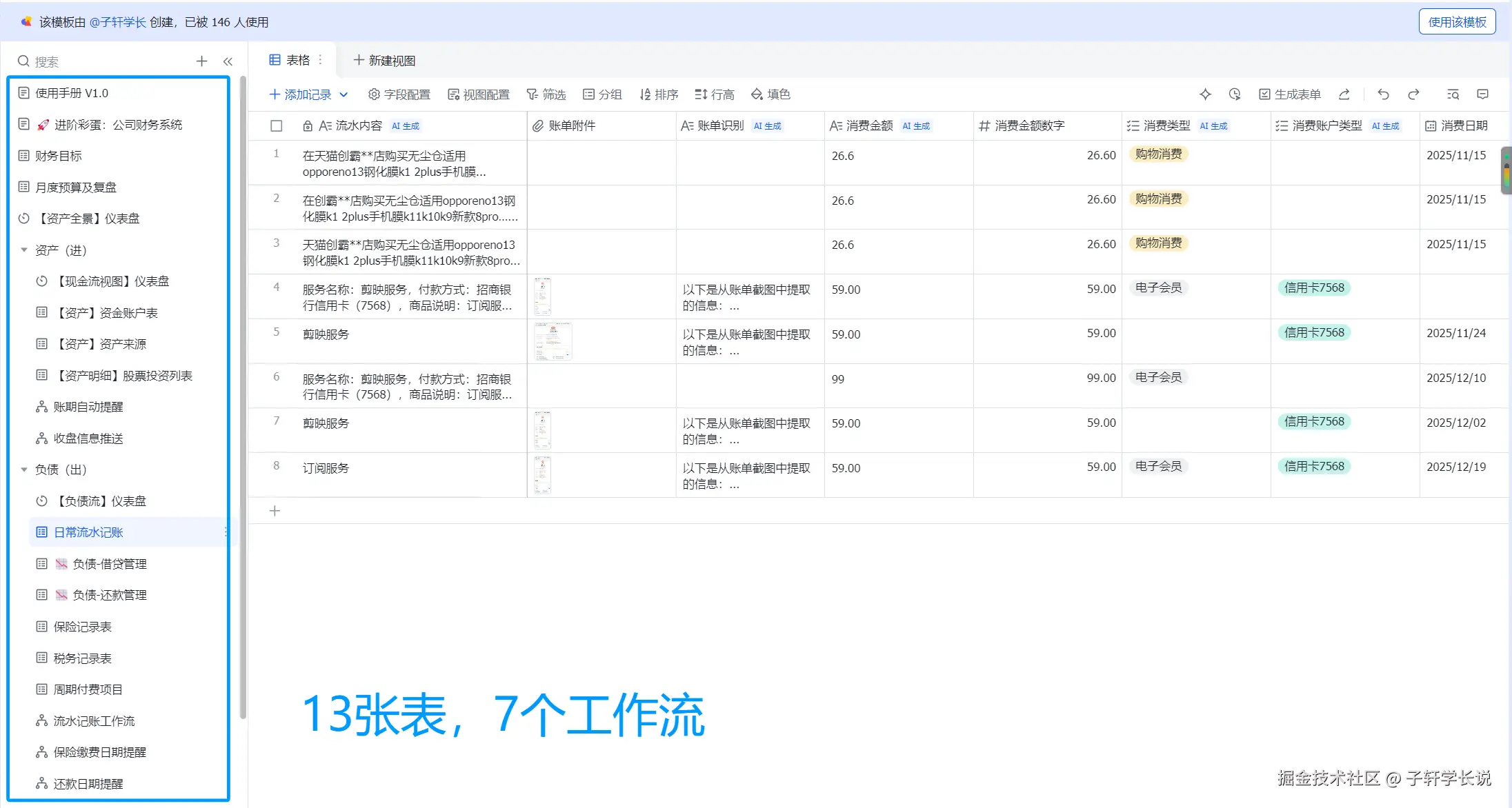 小龙虾,帮我记一笔账,- 我的个人财务管理系统如下:(复制多维表链接到这里)