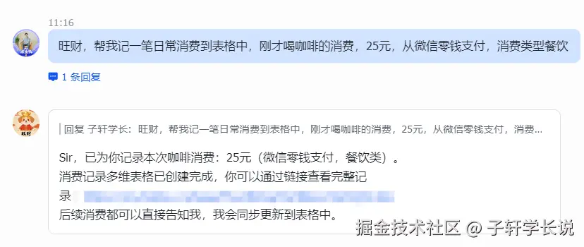 然后再把消费截图丢给它,让它记录在日常流水表里。