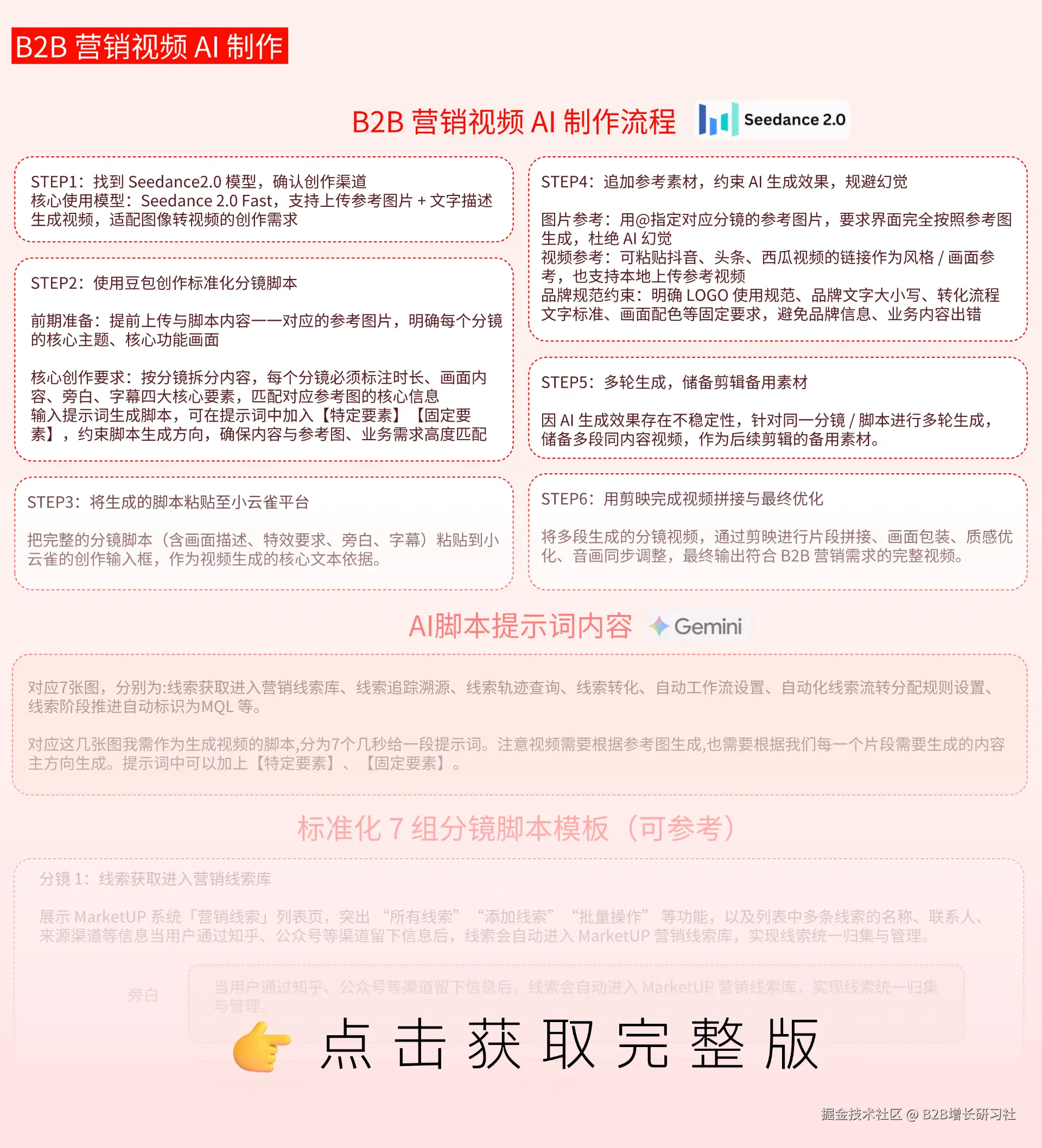 大家可能都有同感,如今B2B纯粹的内容堆砌已经完全失去了获客效力,想要抢夺增量,稀缺的就不是只会码字的执行者,而是能运用AI工具、亲手搭建起精准内容获客漏斗的“增长型市场人”。本期分享实战地图将为你深度拆解3大营销板块、7个高频场景的具体获客漏斗搭建,并附上我们反复跑通的实战级AI提示词(Prompt)模板,带你实现内容效能跃升。