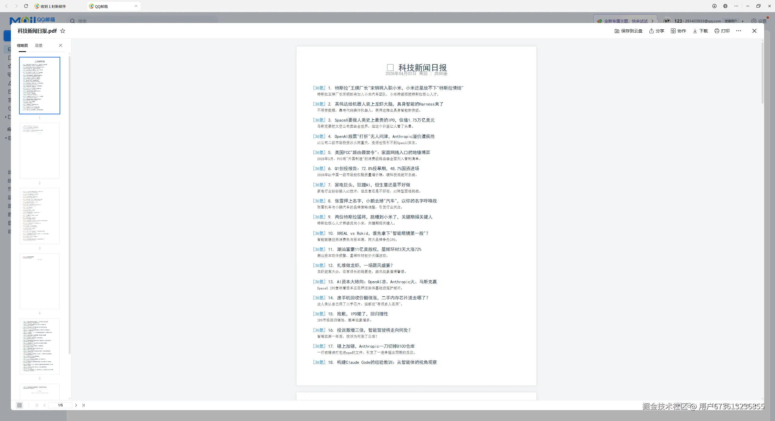 帮我爬取 36 氪、虎嗅、IT 之家三个网站的最新科技新闻,提取前 20 条有效资讯,整理成带标题、来源、摘要的简报,保存为 PDF 格式,然后发到我的 QQ 邮箱