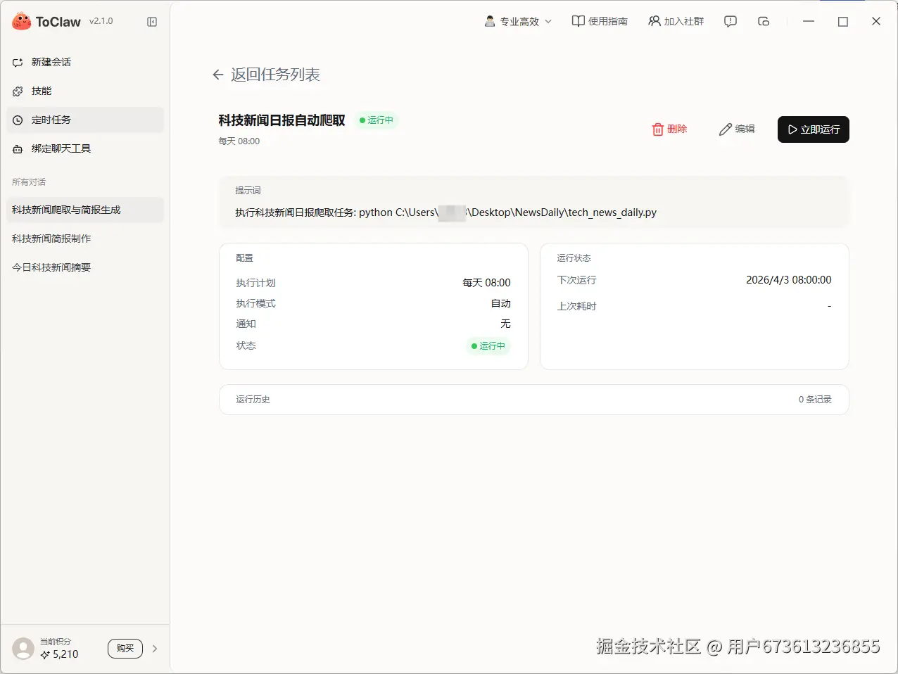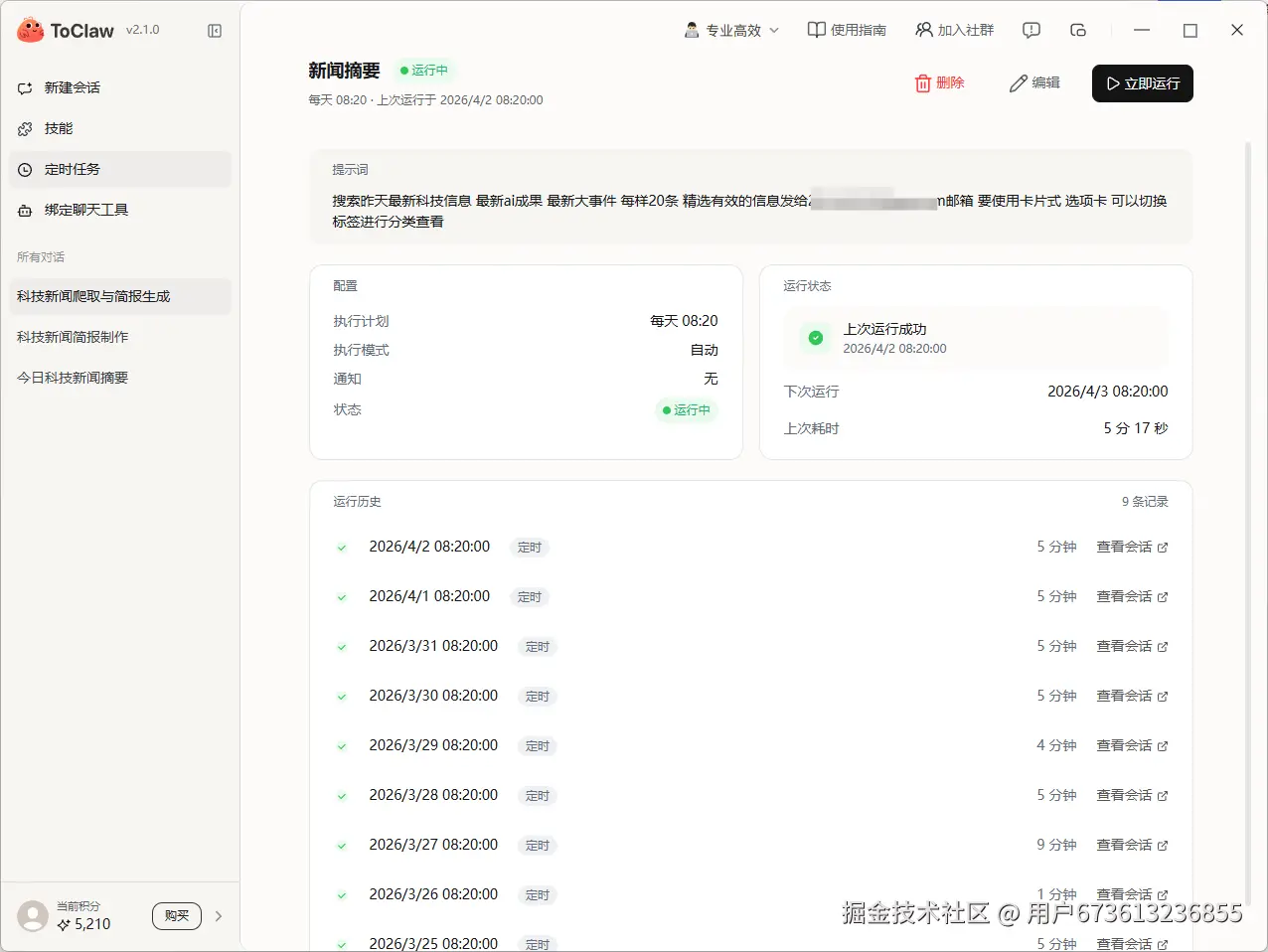 早报任务是我最常用的核心功能,依托ToClaw自带的定时任务,无需电脑长期开机,到设定时间自动启动执行,流程顺畅不卡顿。