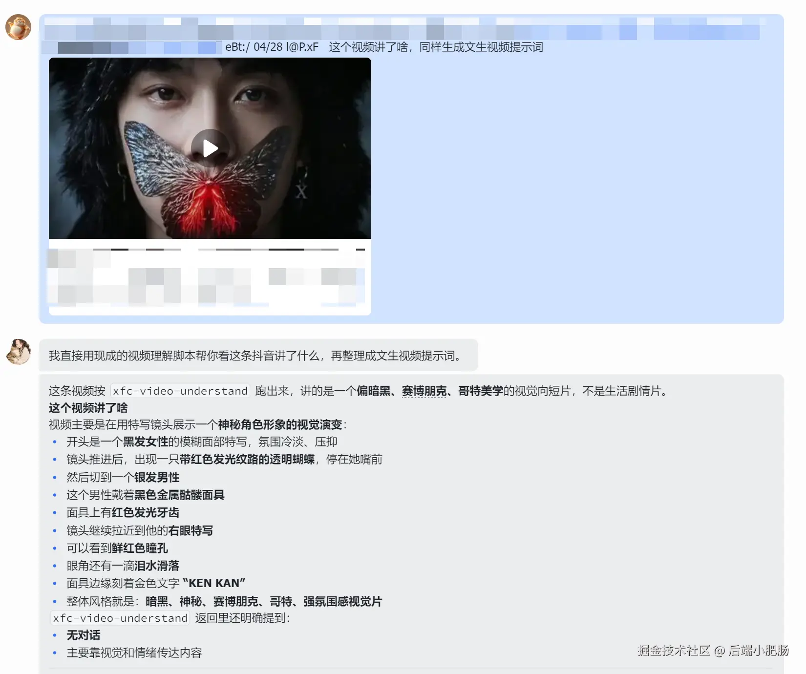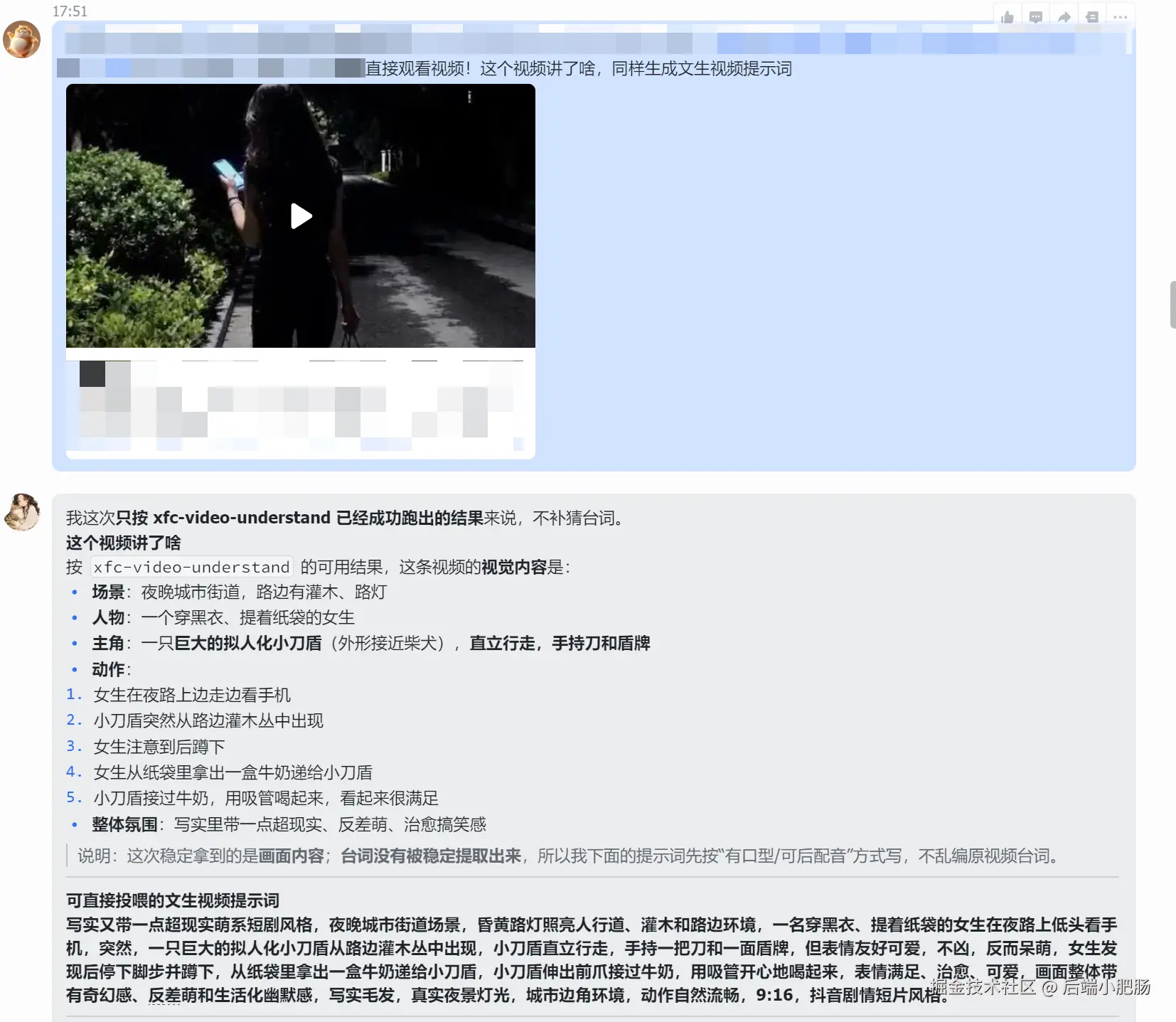 我做了两个示例,第一个是刀盾狗的,直接发视频的分享链接发送到skill,让它反推提示词: