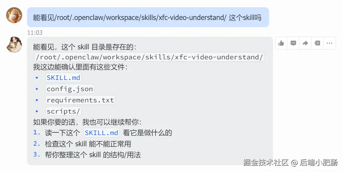回到openclaw会话界面二次确认skill是否存在,若存在就能像开头那样使用了: