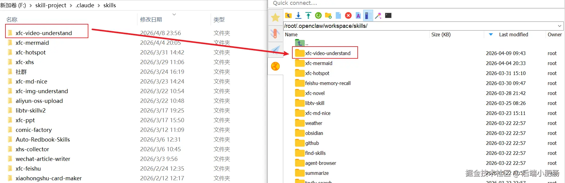 skill编写完只要将其集成至Openclaw就可以顺利调用了,集成方式很简单,只需将skill文件夹上传至Openclaw服务器所在的/root/.openclaw/workspace/skills文件夹下: