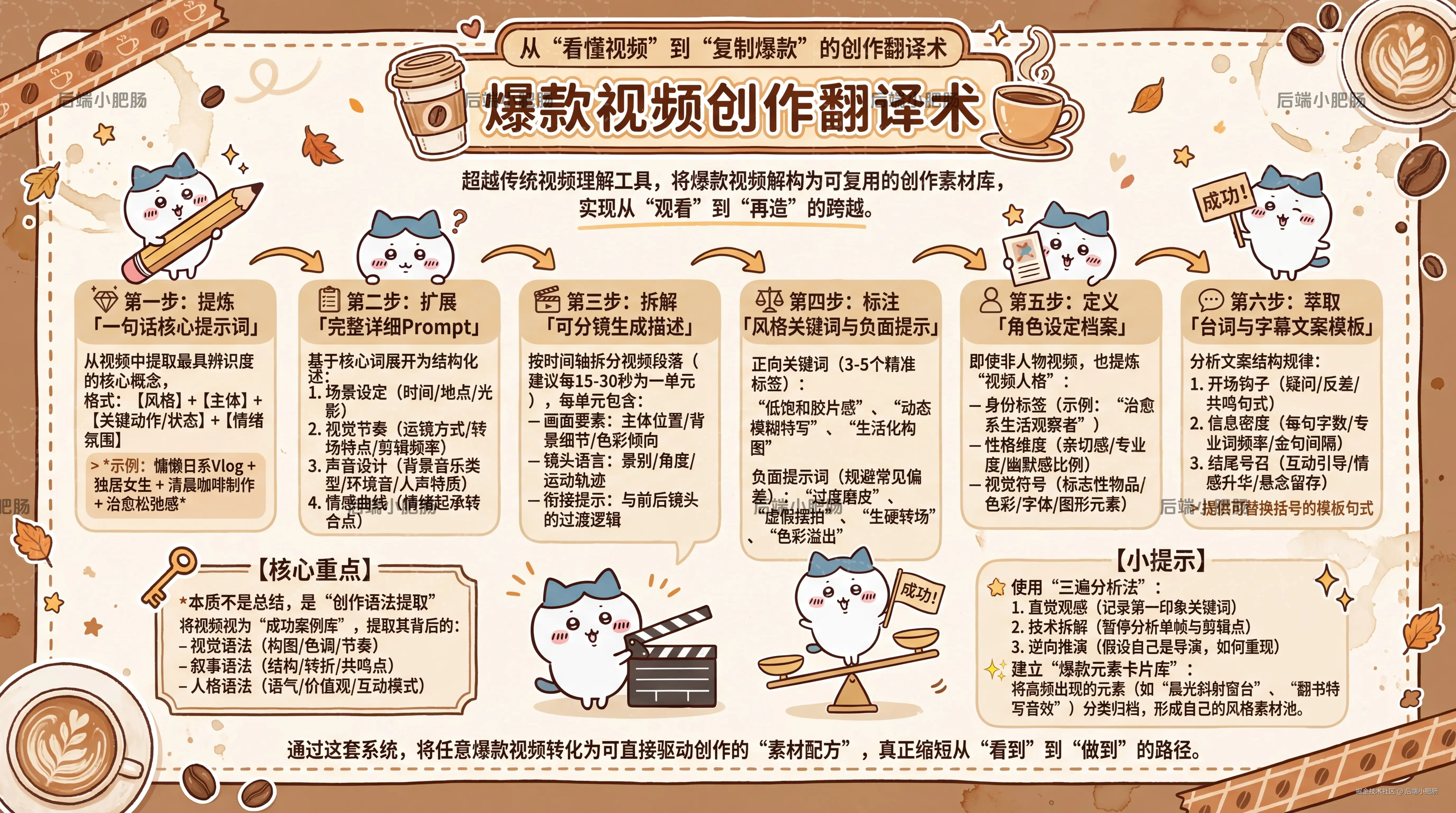 我做这个 skill,并不是单纯想做一个“视频理解工具”。因为现在很多模型都能大概总结视频内容,告诉你视频里有谁、发生了什么、画面是什么风格。但这些信息离“我能不能继续做出一个类似风格的视频”,中间其实还差很大一截。我真正想要的是把一个爆款视频尽量翻译成一套可复用的创作素材。包含以下核心内容: