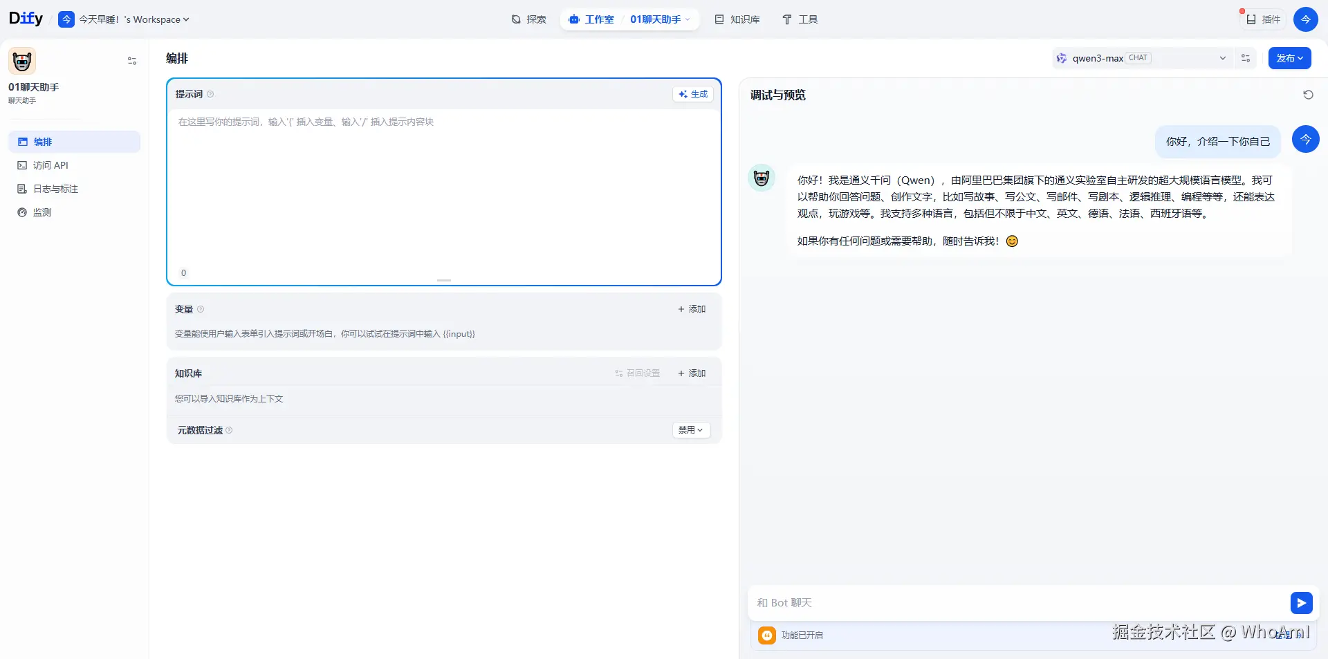 到此,我们就已经成功完成了Dify的入门,并拥有了一个自己的第一个AI聊天助手。接下来,还可以探索更高级的功能,比如为助手添加知识库,或者使用工作流来构建更复杂的AI应用。