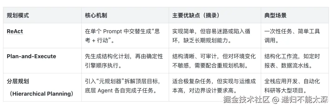 对大多数企业级场景,用结构化计划配合“异常触发重规划”已经足够稳健;只有在特别开放、长期的任务中,才需要引入多层规划与多 Agent 协作。