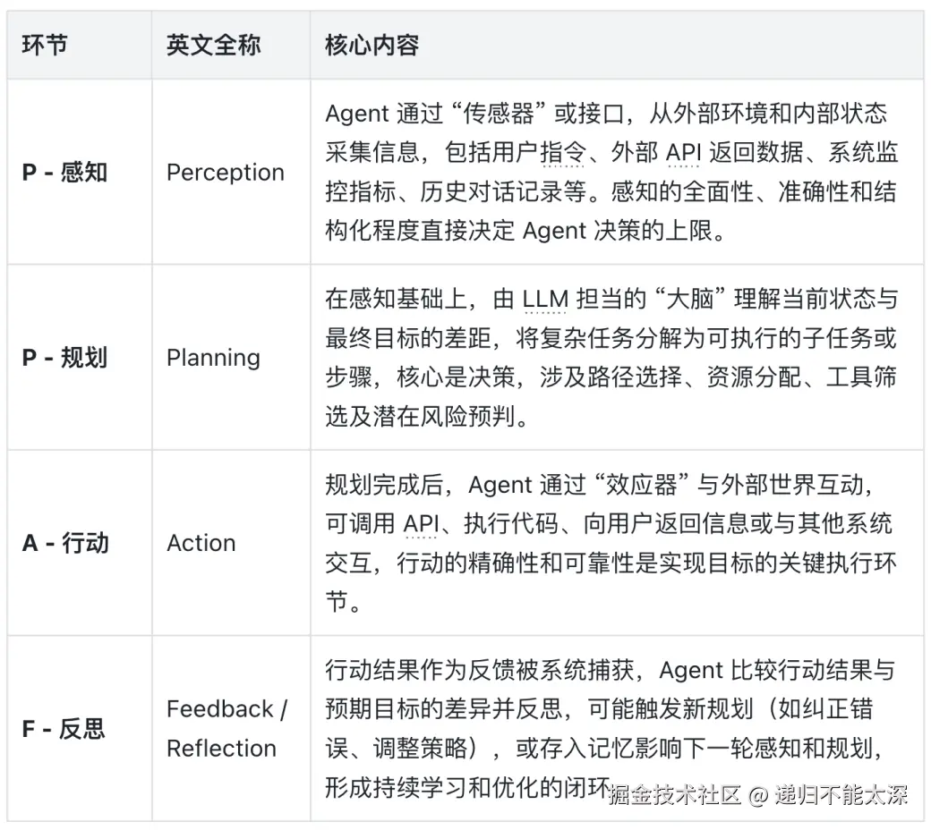 Loop (循环): 这个“读取-评估-打印”的过程不断循环,直到 Agent 达到目标状态或触发终止条件,构成了 PPAF 的核心驱动力。