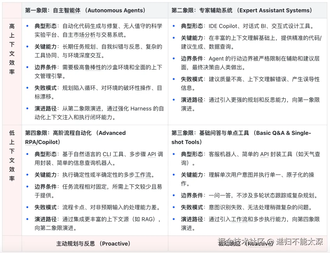 为了更系统地理解不同类型 Agent 的能力边界和工程挑战,我们可以构建一个二维的战略分析矩阵。该模型从“认知循环”和“上下文效率”两个维度对 Agent 应用进行划分。