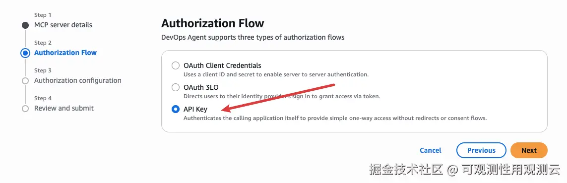 AWS DevOps Agent 支持 OAuth Client Credentials、OAuth 3LO、API Key 三种授权流程,本次接入观测云 MCP 需选择 API Key 授权方式,该方式无需重定向与授权确认流程,可直接对调用应用进行身份验证,实现简单高效的单向访问授权,具体配置步骤如下: