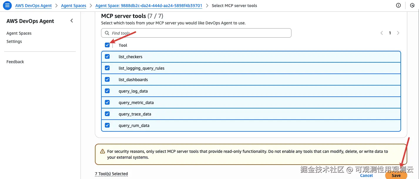 1、进入目标 Agent Space 的 MCP server tools 配置页面,页面将展示可选择的 MCP 工具列表,本次接入需将所有 MCP Tool 工具全部添加,包含list_checkers、list_logging_query_rules、list_dashboards、query_log_data、query_metric_data、query_trace_data、query_rum_data共 7 项;