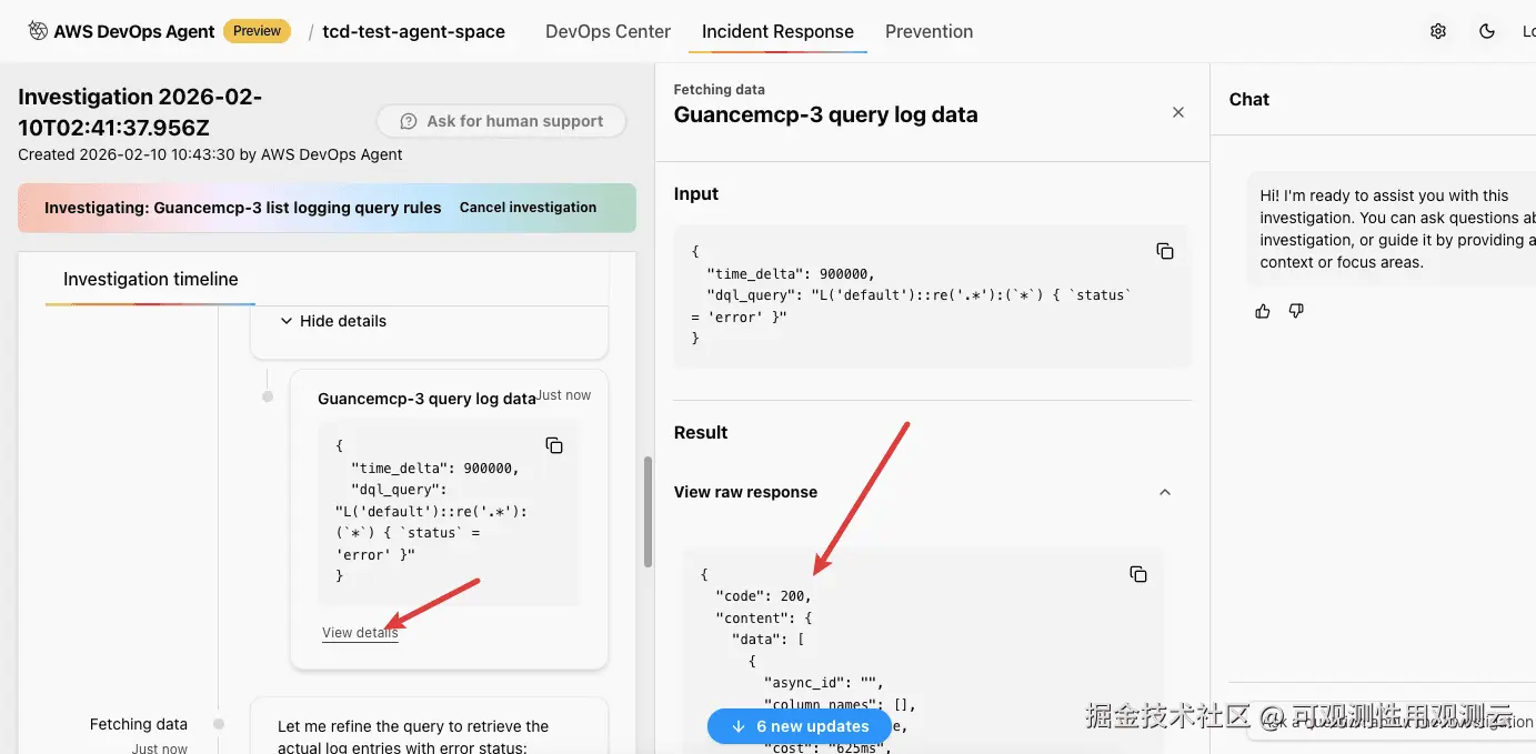3、获取调查结果:调查完成后,DevOps Agent 将输出完整的分析报告,包含错误分类、原始日志样本、统计数据、核心发现等内容。