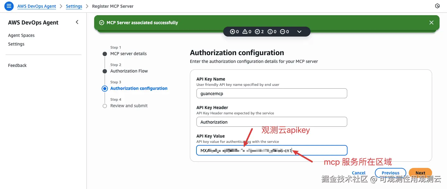 完成以上配置后,依次点击 “Previous” 核对信息,确认无误后点击 “Next” 提交,页面提示 “AWS DevOps Agent MCP Server associated successfully” 即代表 MCP 服务器基础配置完成。