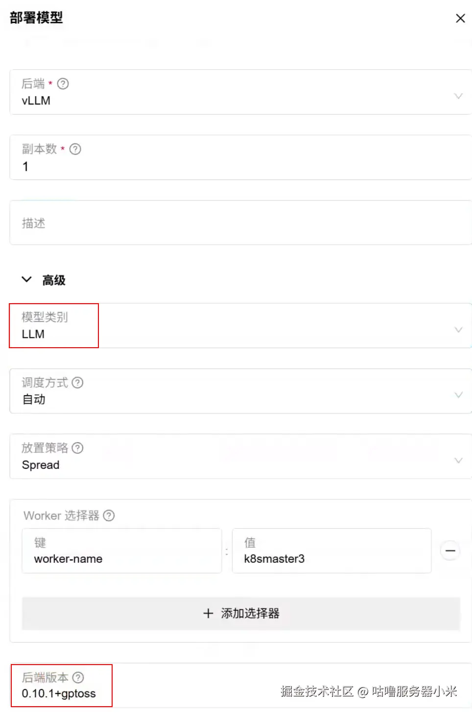 在部署页面,展开高级配置,设置模型类别为 LLM。并在后端版本中,填写自定义后端版本为 0.10.1+gptoss,GPUStack 会自动调用 /var/lib/gpustack/bin/vllm_0.10.1+gptoss 来运行模型: