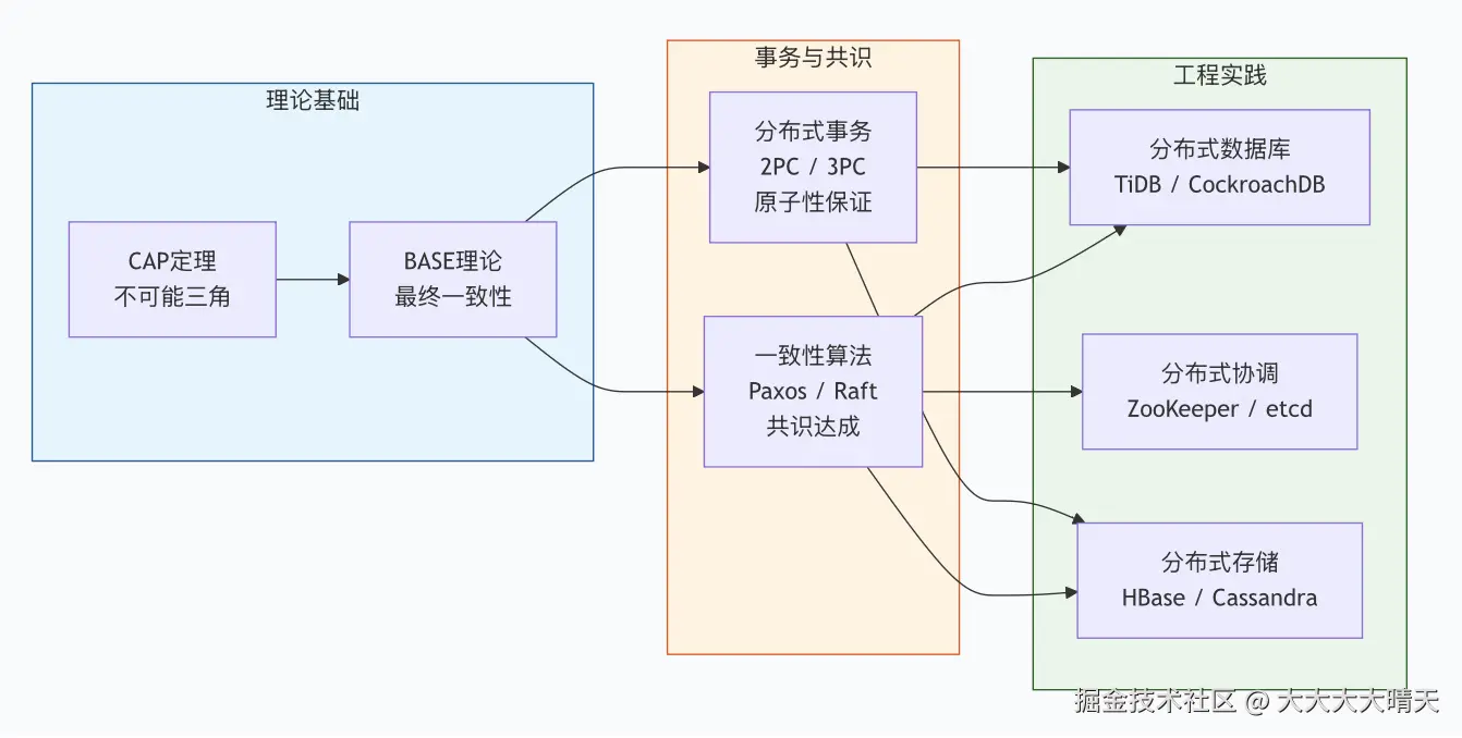 分布式理论、分布式事务、分布式一致性算法,是大数据分布式处理的三大核心基石——CAP给出了约束条件,事务协议解决了“原子性”问题,一致性算法解决了“共识”问题。一个成熟的分布式存储系统,通常需要同时运用这些技术:用一致性算法(如Raft)管理元数据和选主,用分布式事务协议(如2PC或TCC)处理跨分片写入,最终在CAP的约束下做出符合业务需求的取舍。
