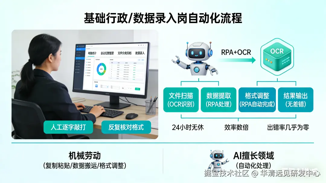 行政工作里的考勤统计、会议纪要整理、文件分类归档、各类数据录入,这些曾需要专人花费大量时间完成的事,如今一套 RPA 机器人加 OCR 技术就能全流程自动化。
