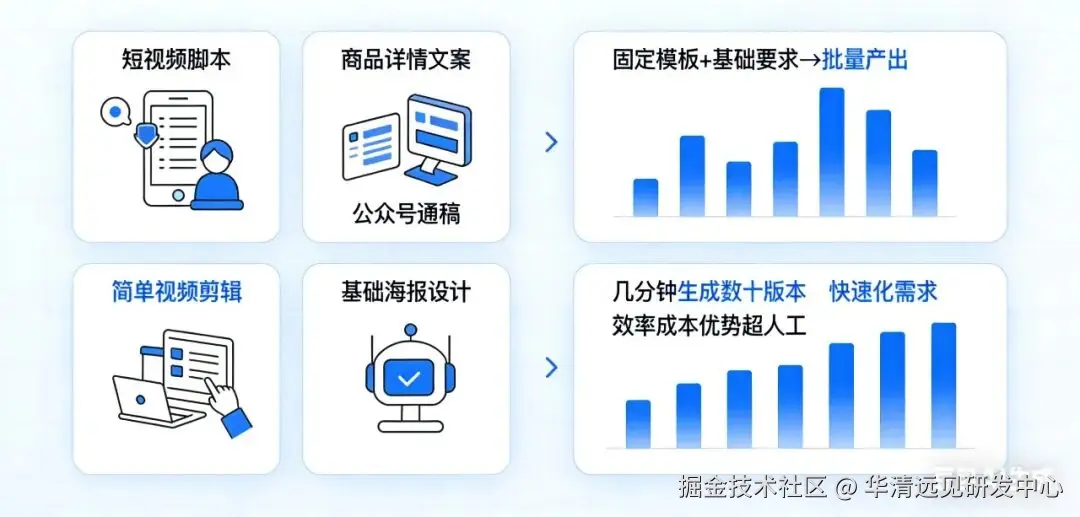 短视频脚本、商品详情文案、公众号通稿、简单视频剪辑、基础海报设计,这些标准化的内容生产工作,AI 已经能熟练完成。不需要独特观点,不需要深度创意,只要有固定模板和基础要求,AI 就能批量产出。