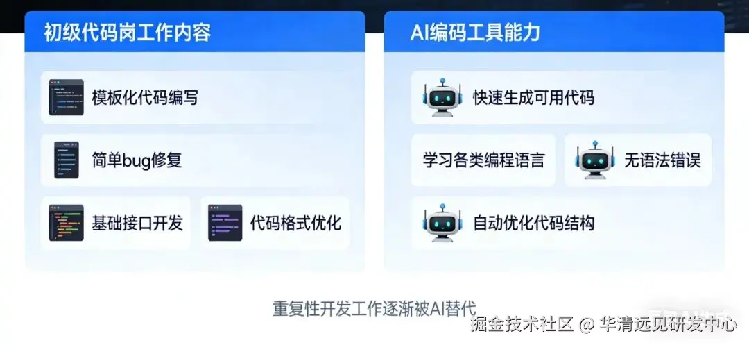 模板化代码编写、简单 bug 修复、基础接口开发、代码格式优化,这些重复性的开发工作,AI 编码工具已经能直接完成。不需要复杂的逻辑设计,不需要深度的技术沉淀,只要遵循固定框架和规范,AI 就能快速生成可用的代码。