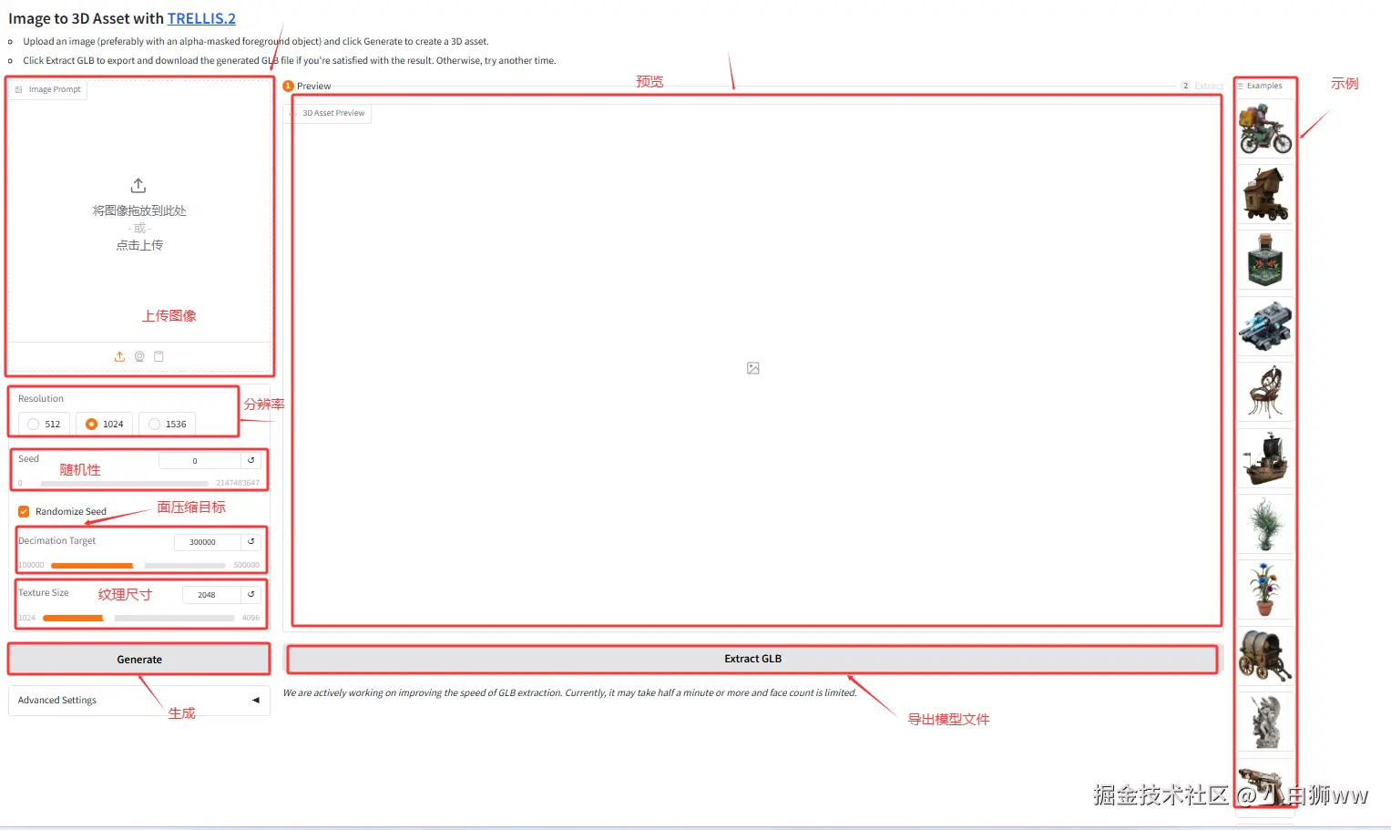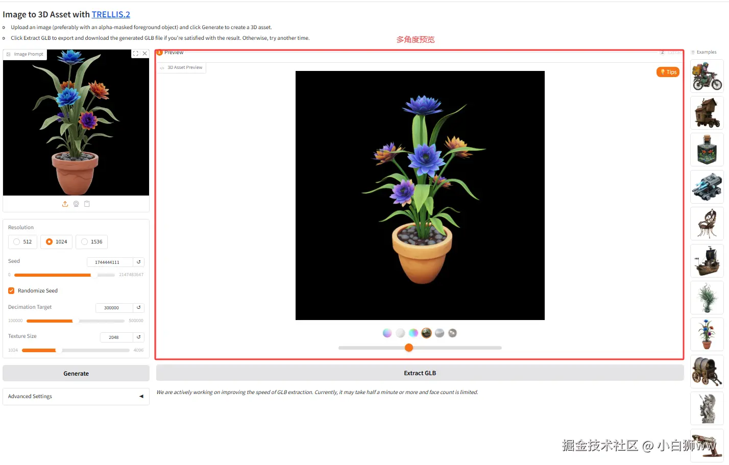 4.输入完成后点击运行,稍等片刻右侧结果框生成预览,点击 Extract GLB 导出 .glb 文件。