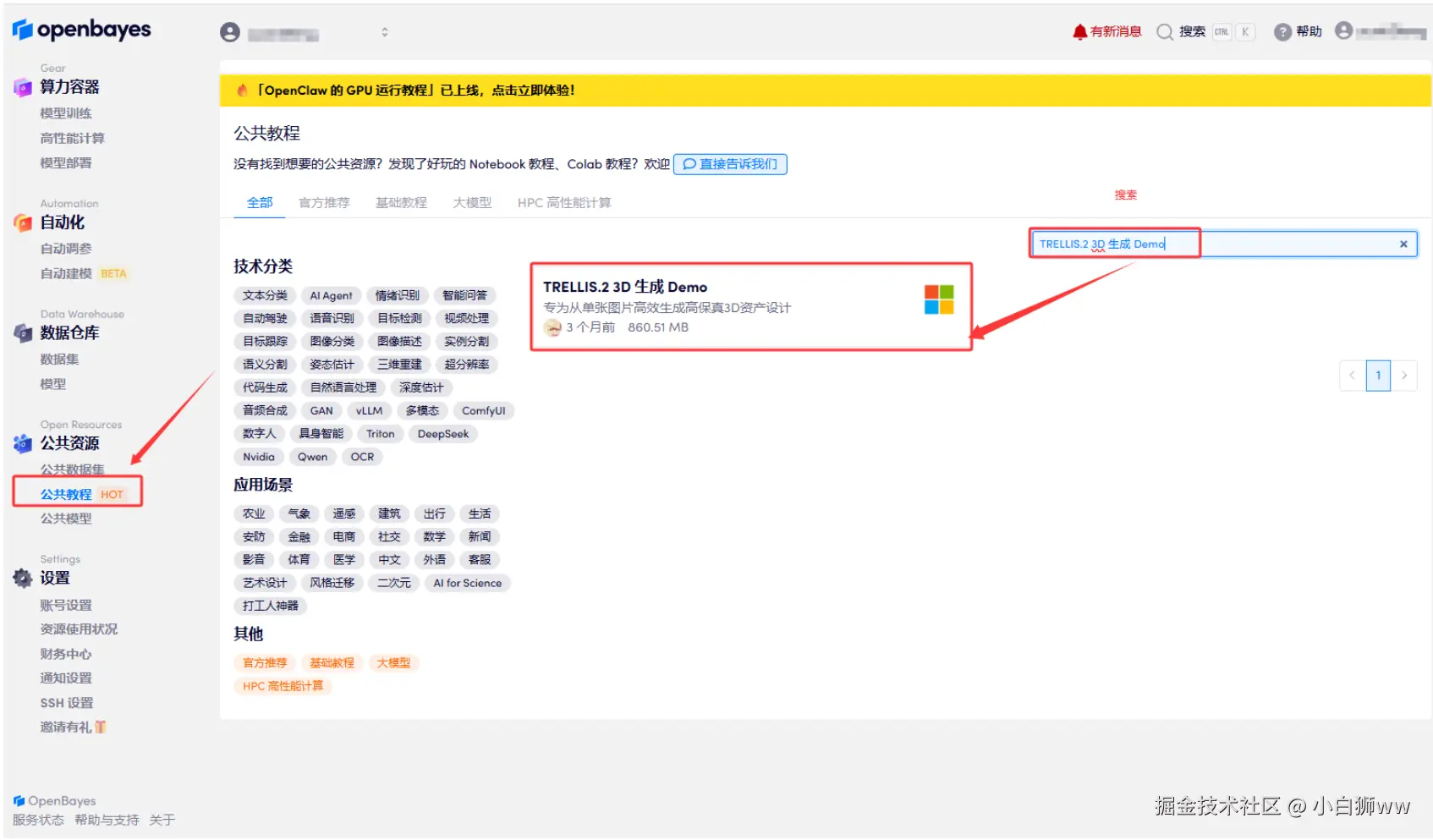 1.登录 OpenBayes.com,在「公共教程」页面,搜索并选择「TRELLIS.2 3D 生成 Demo」教程。