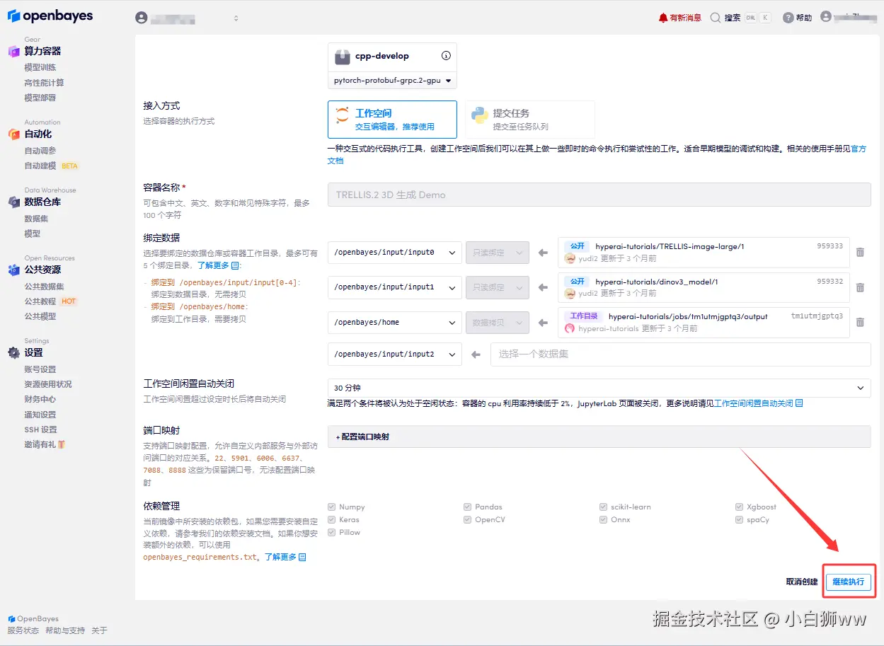 3.在当前页面中看到的算力资源均可以在平台一键选择使用。平台会默认选配好原教程所使用的算力资源、镜像版本,不需要再进行手动选择。点击「继续执行」,等待分配资源。