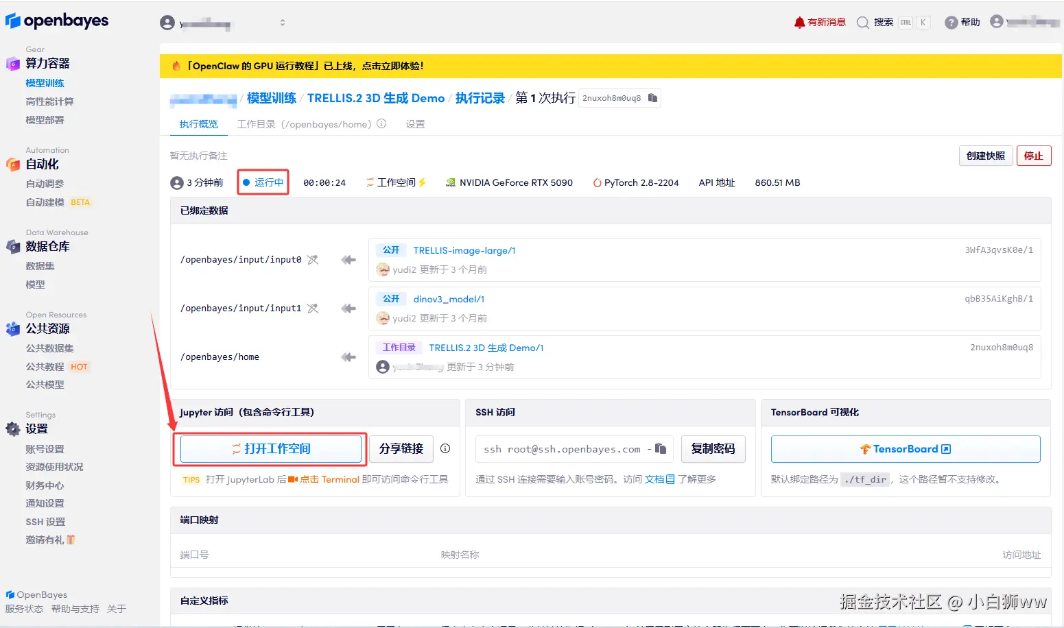 4.等待分配资源,当状态变为「运行中」后,点击「打开工作空间」进入 Jupyter Workspace。