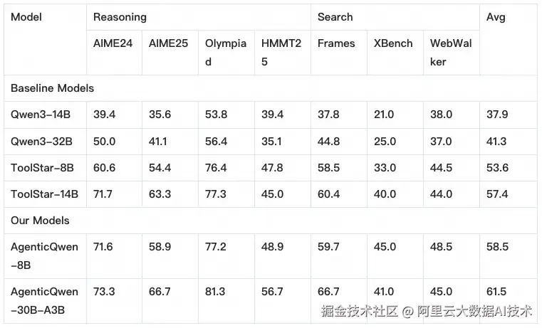 下表进一步给出了本次开源的AgenticQwen 模型在 Agent 能力基准上的整体效果,并与原始 Qwen3 底座以及面向 Agent 场景的专用小模型 ToolStar-8B/14B 进行对比。整体结论是:在相近甚至更小的参数规模下,AgenticQwen 系列在多任务、多轮工具调用的综合指标上取得了更强的可用性,验证了“轨迹闭环训练”对 Agent 落地能力的高密度增益。