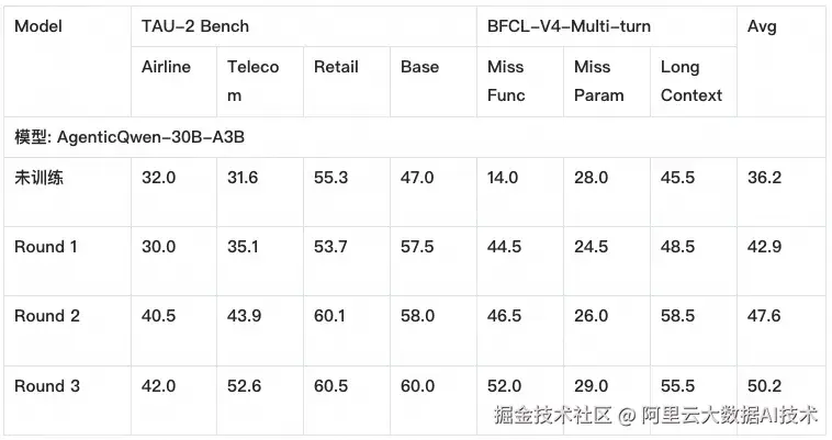 下表展示了 AgenticQwen-30B-A3B(以 Qwen3-30B-A3B 为底座)在多轮数据飞轮训练中,TAU-2 Bench 与 BFCL-V4-Multi-turn 两个 Agent 基准上的提升趋势。我们可以看到,随着轮次推进,模型不仅整体分数上升,也在如“漏工具(Miss Func)”“漏参数(Miss Param)”“长上下文(Long Context)”等更贴近真实落地痛点的子项上获得改进,体现出飞轮对“复杂流程鲁棒性”的持续强化。