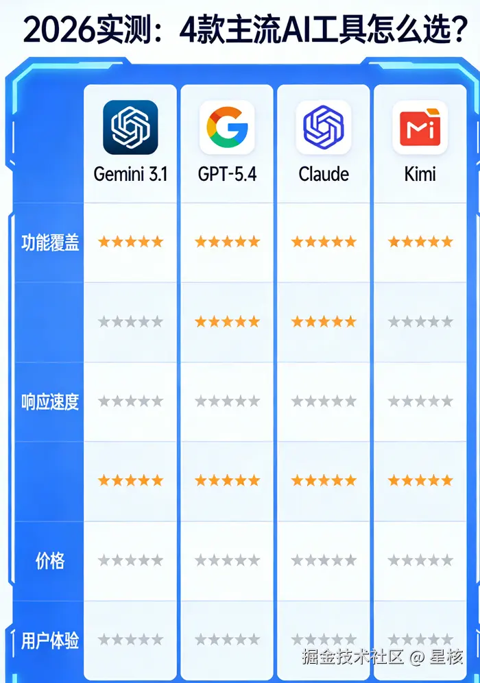 没有绝对最好的 AI,只有最适合你当下用途的。想要灵活、创意、实时 → Gemini 3.1想要稳定、正式、严谨 → GPT-5.4想要读长文档、整理资料 → Claude / Kimi