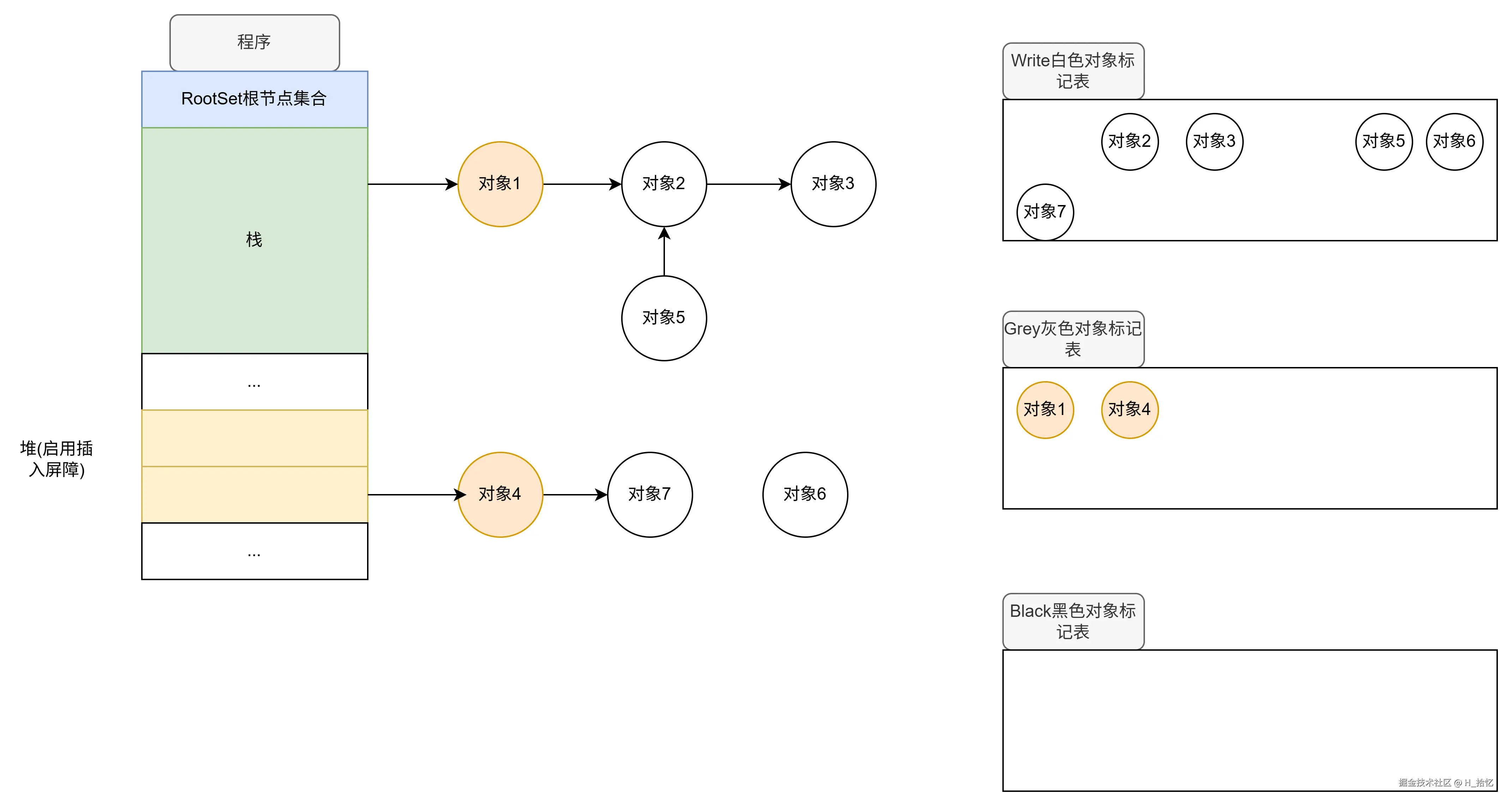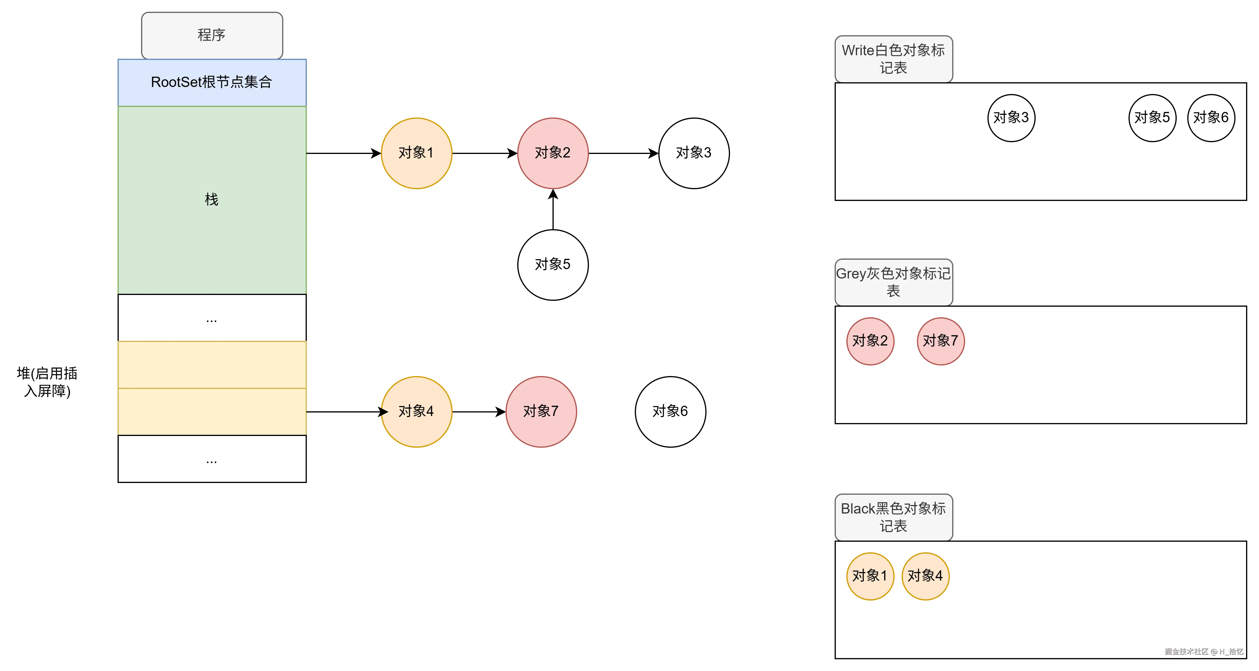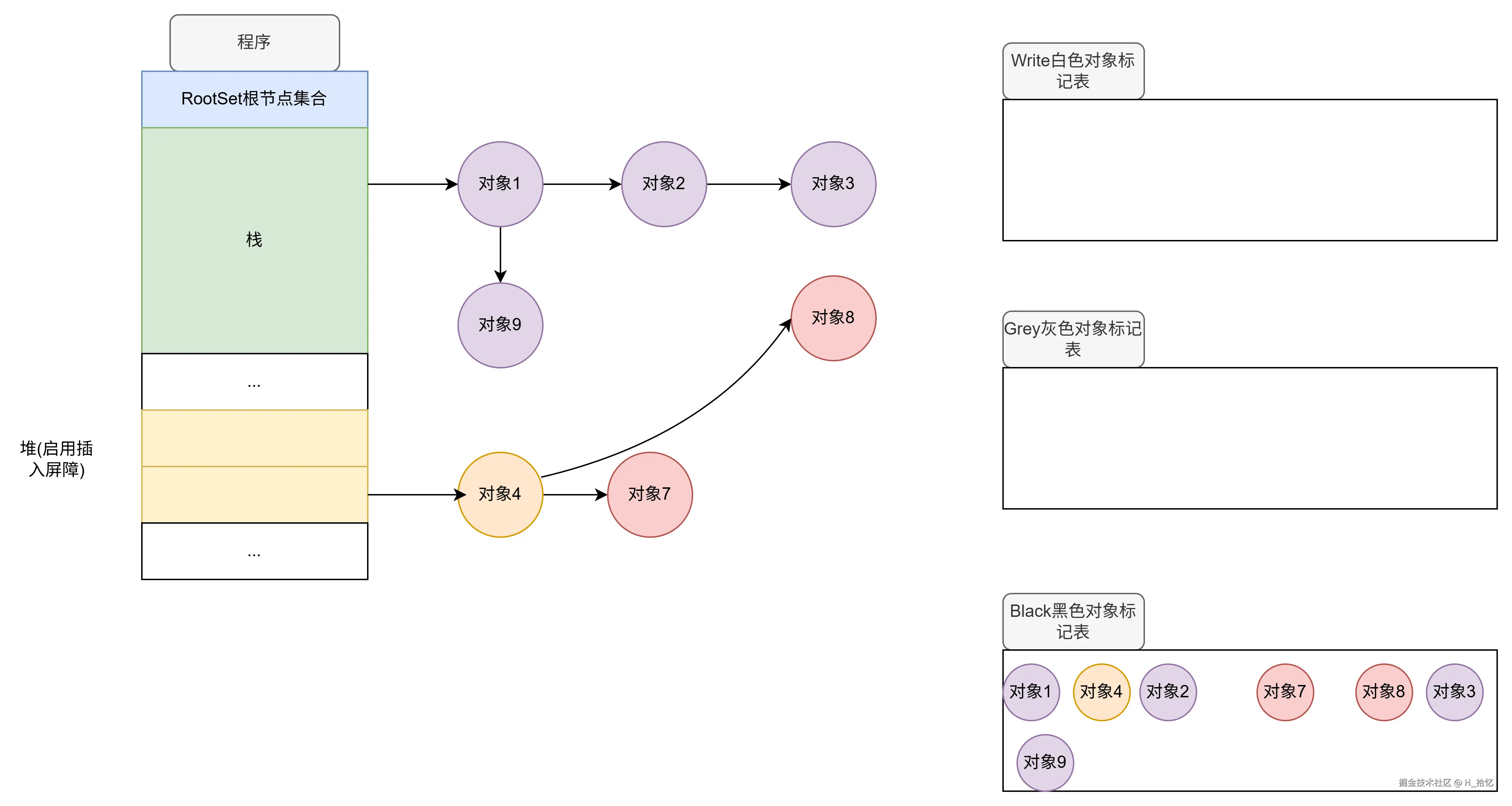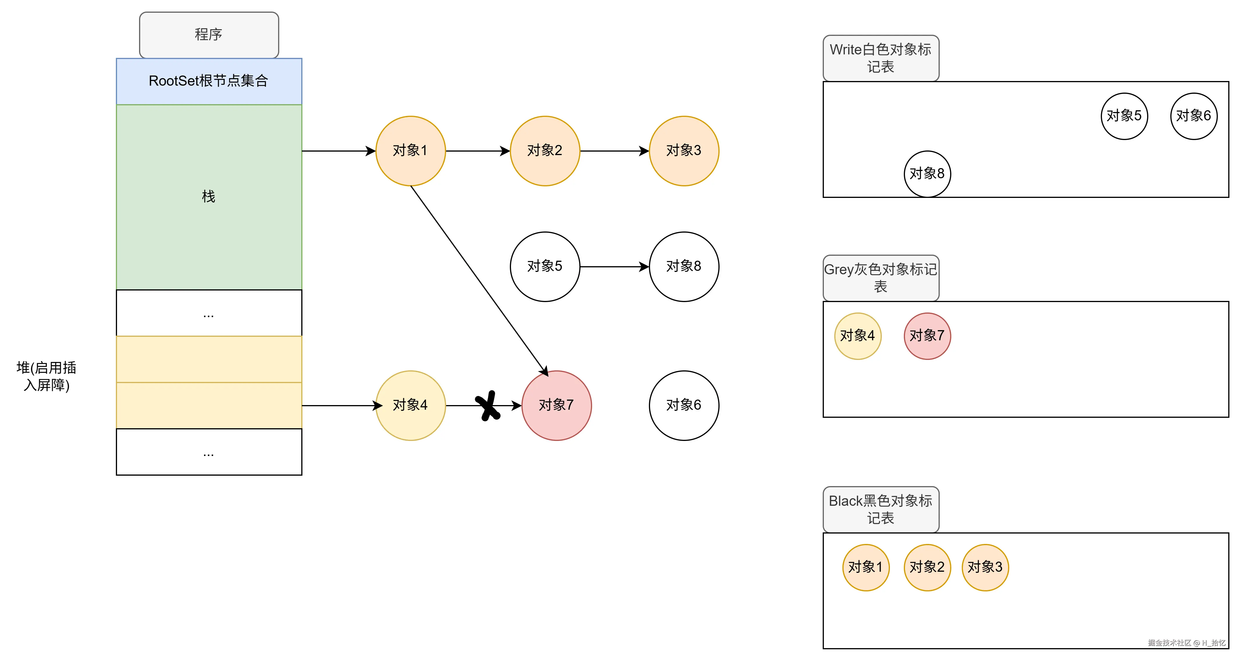 最后执行第三天语句.对象2属于栈范围内.所以依然不触发写屏障机制.对象2直接将对象3从下游移除.如图所示.