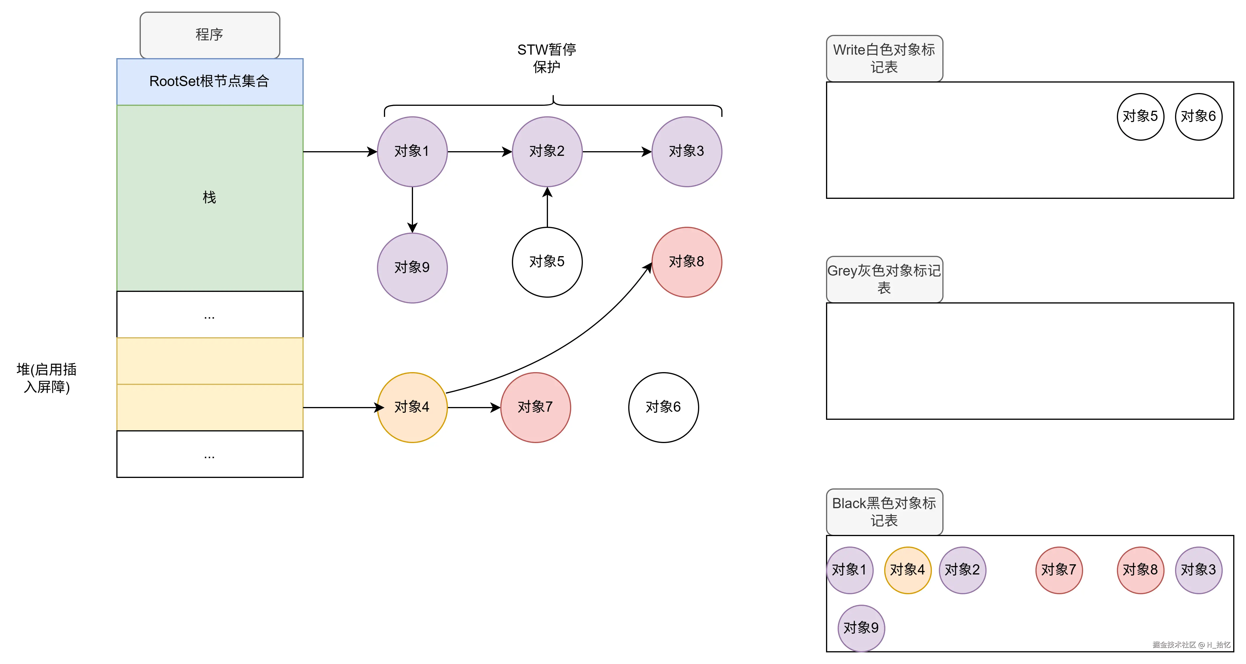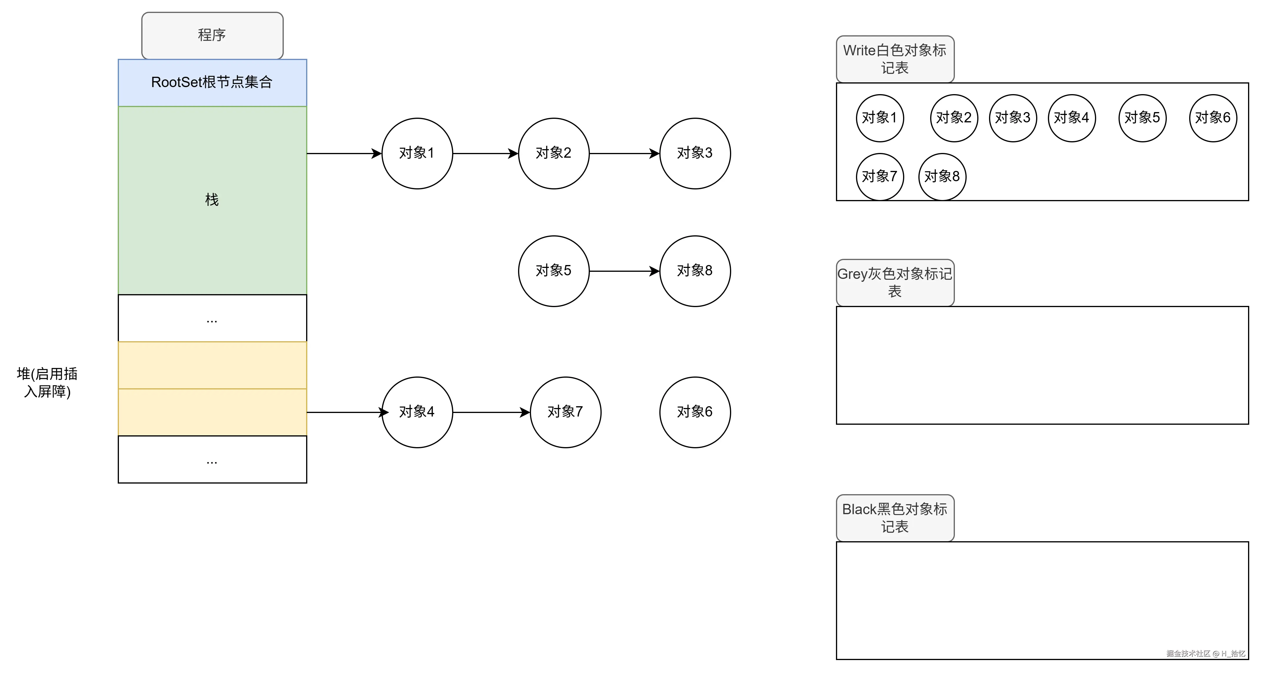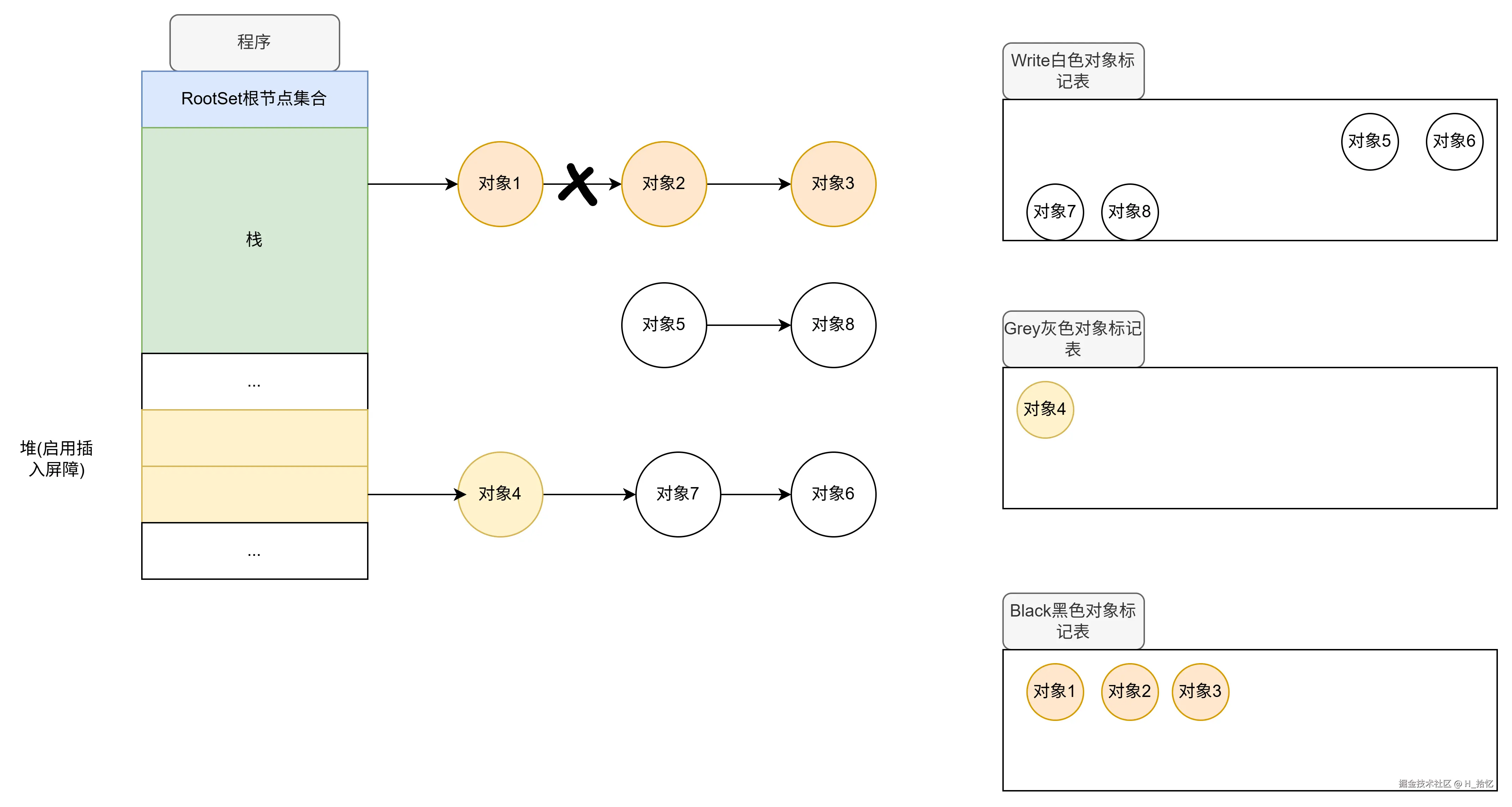 最后执行第三天语句.对象2属于栈范围内.所以依然不触发写屏障机制.对象2直接将对象3从下游移除.如图所示.