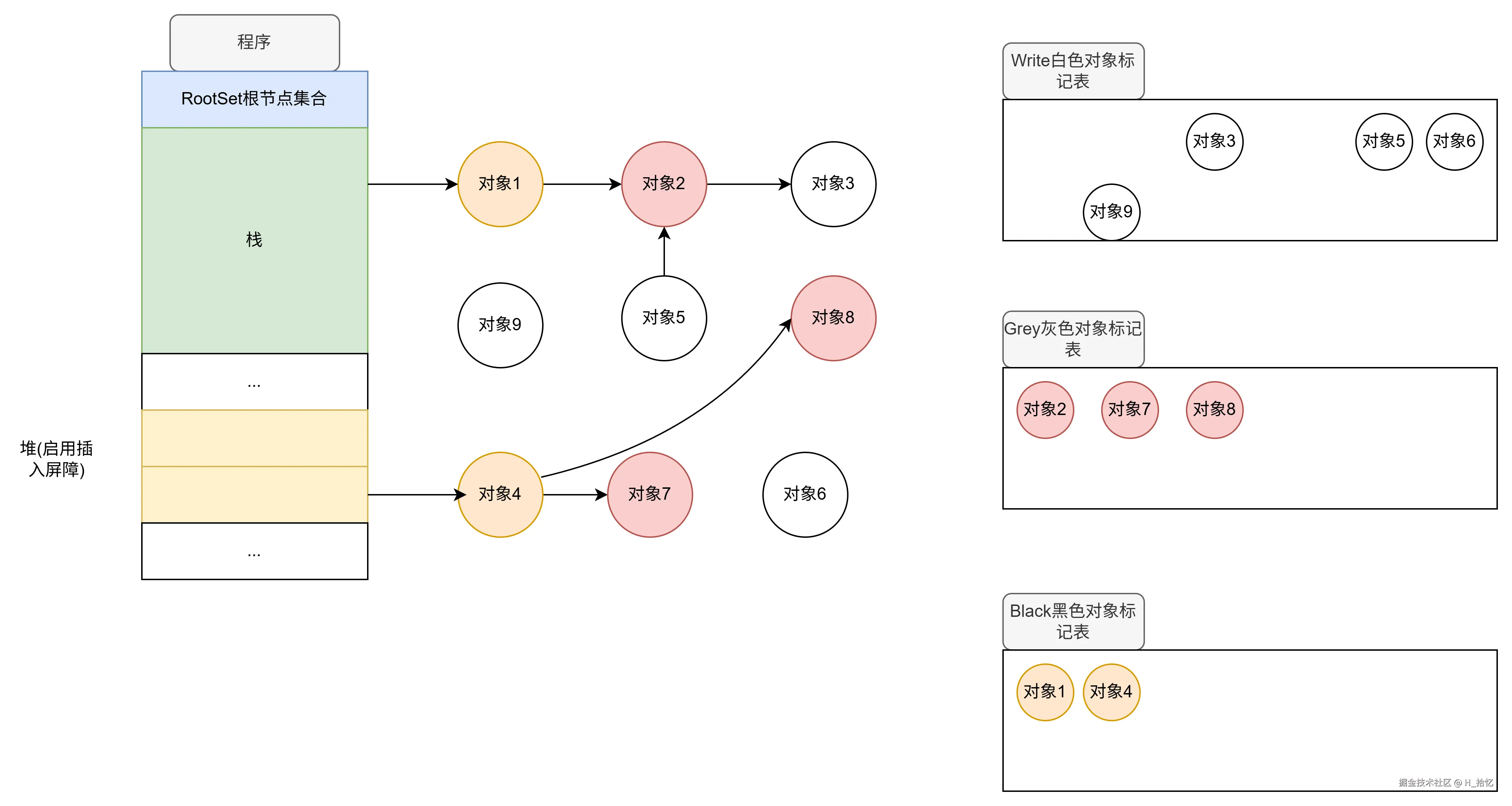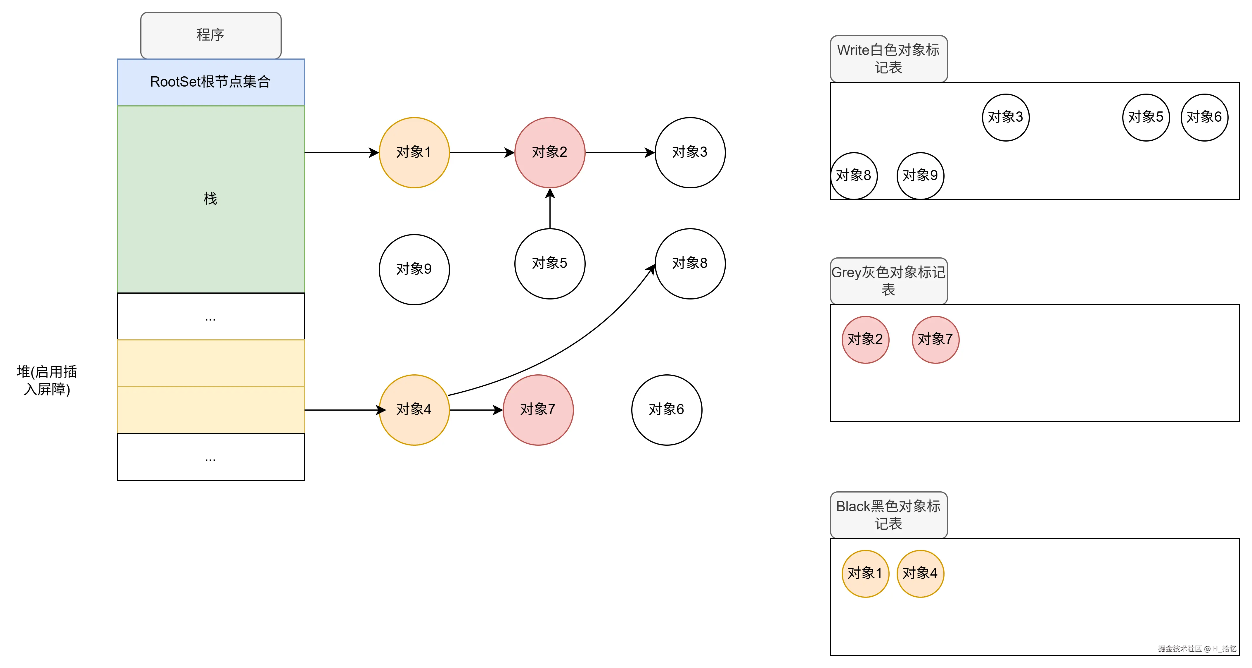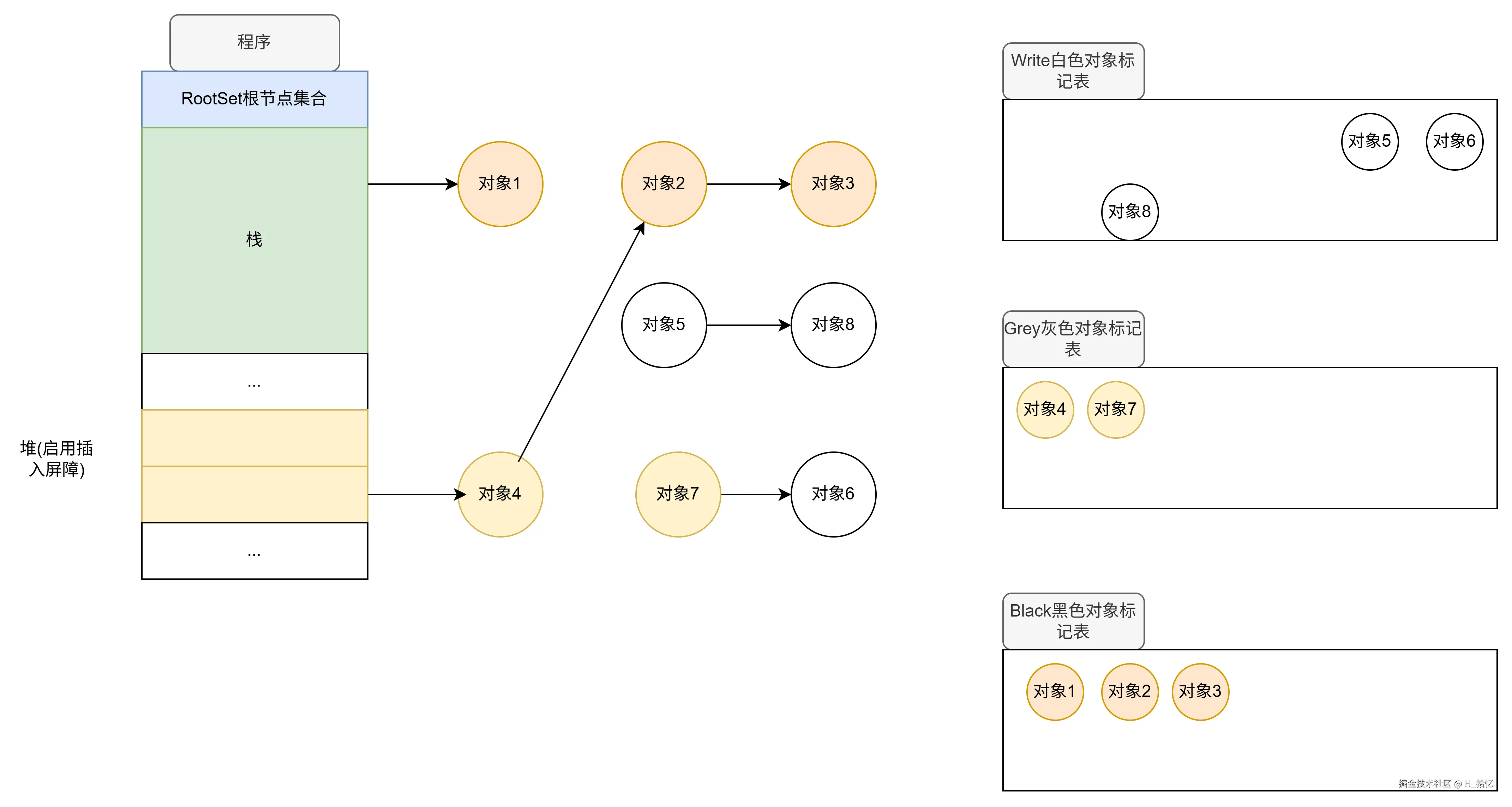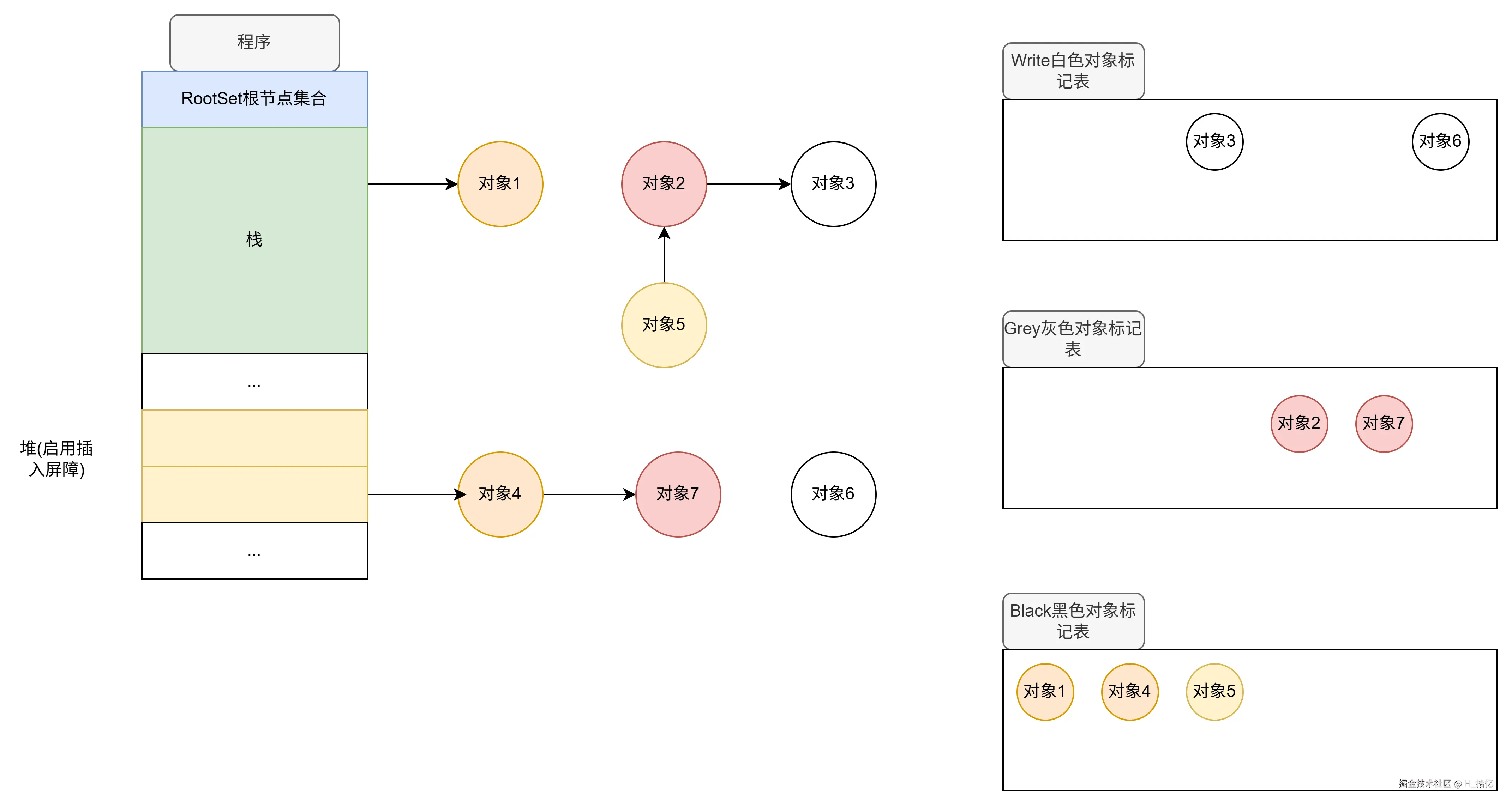 最后执行第三天语句.对象2属于栈范围内.所以依然不触发写屏障机制.对象2直接将对象3从下游移除.如图所示.