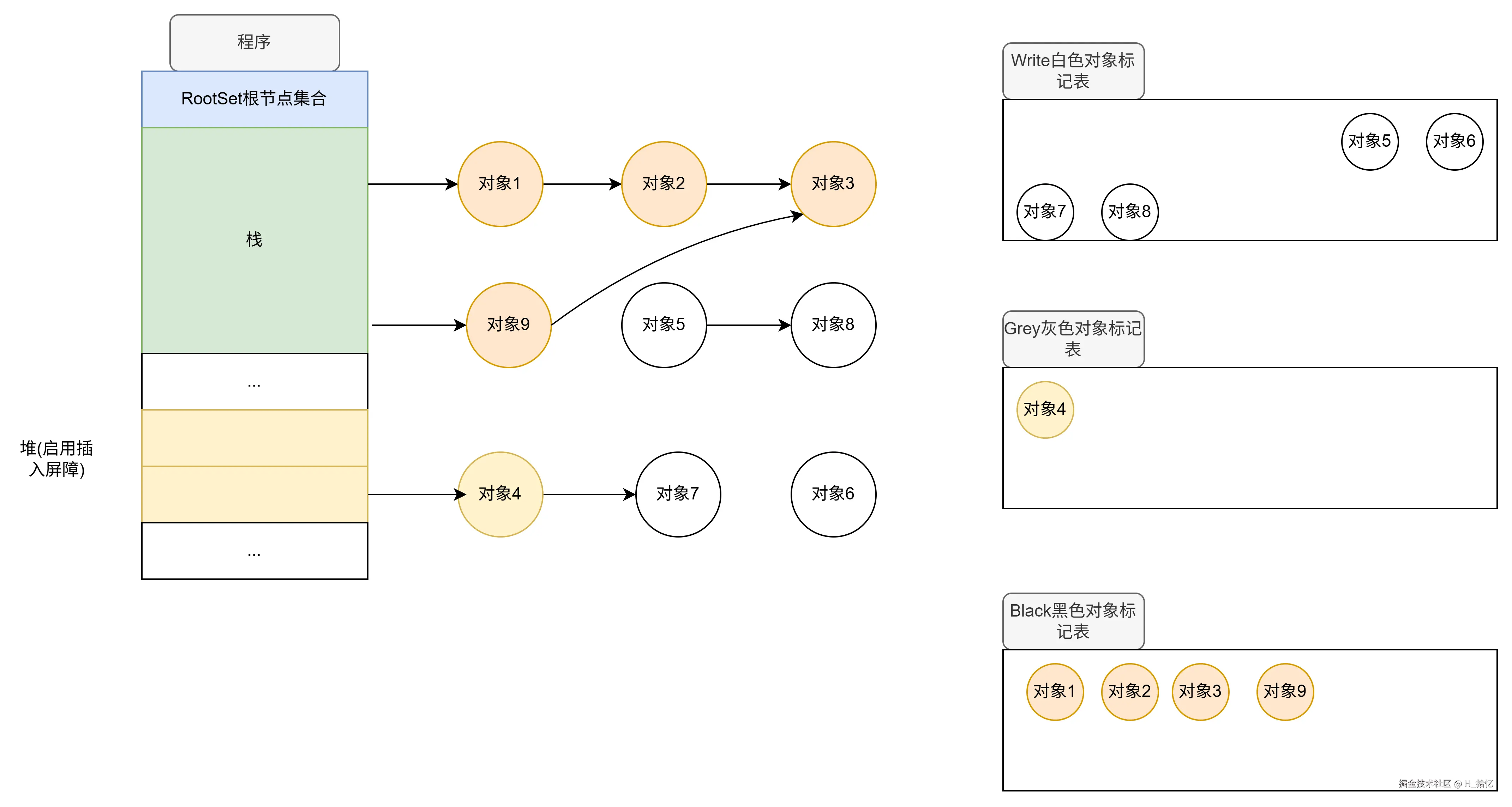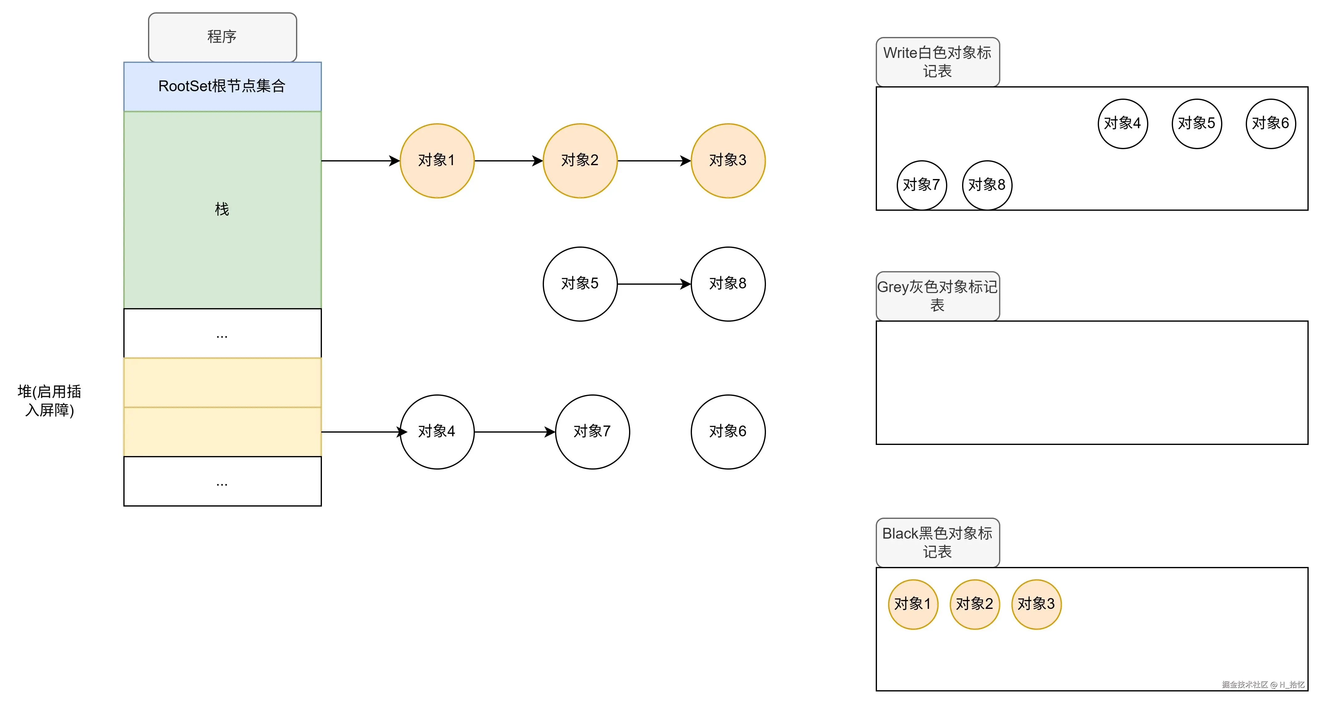执行第一条语句.new栈对象9.根据混合写屏障的限定条件.任何在栈范围上新创建的内存对象均会被标记为黑色.如图所示.